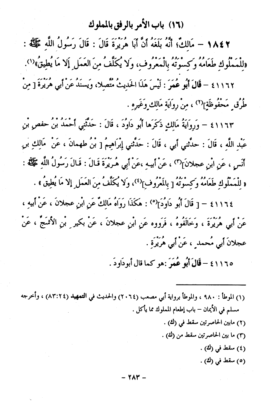41163 - وَرِوَايَةُ مَالِكٍ ذَكَرَهَا أَبُو دَاوُدَ، قَالَ: حَدَّثَنِي أَحْمَدُ بْنُ حَفْصِ بْنِ عَبْدِ اللَّهِ، قَالَ: حَدَّثَنِي أَبِي، قَالَ: حَدَّثَنِي إِبْرَاهِيمُ بْنُ طَهْمَانَ، عَنْ مَالِكِ بْنِ أَنَسٍ، عَنِ ابْنِ عَجْلَانَ، عَنْ أَبِيهِ، عَنْ أَبِي هُرَيْرَةَ قَالَ: قَالَ رَسُولُ اللَّهِ - صَلَّى اللَّهُ عَلَيْهِ وَسَلَّمَ -: " لِلْمَمْلُوكِ طَعَامُهُ وَكِسْوَتُهُ بِالْمَعْرُوفِ، وَلَا يُكَلَّفُ مِنَ الْعَمَلِ إِلَّا مَا يُطِيقُ ".