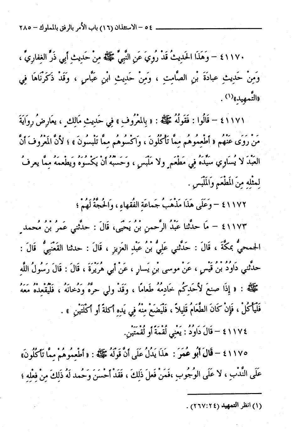 41171 - قَالُوا: فَقَوْلُهُ - صَلَّى اللَّهُ عَلَيْهِ وَسَلَّمَ -: " بِالْمَعْرُوفِ " فِي حَدِيثِ مَالِكٍ، يُعَارِضُ رِوَايَةَ مَنْ رَوَى عَنْهُمْ " أَطْعِمُوهُمْ مِمَّا تَأْكُلُونَ، وَاكْسُوهُمْ مِمَّا تَلْبَسُونَ " ; لِأَنَّ الْمَعْرُوفَ أَنَّ الْعَبْدَ لَا يُسَاوِي سَيِّدَهُ فِي مَطْعَمٍ وَلَا مَلْبَسٍ، وَحَسْبُهُ أَنْ يَكْسُوَهُ وَيُطْعِمَهُ مِمَّا يُعْرَفُ لِمَثَلِهِ مِنَ الْمَطْعَمِ وَالْمَلْبَسِ.