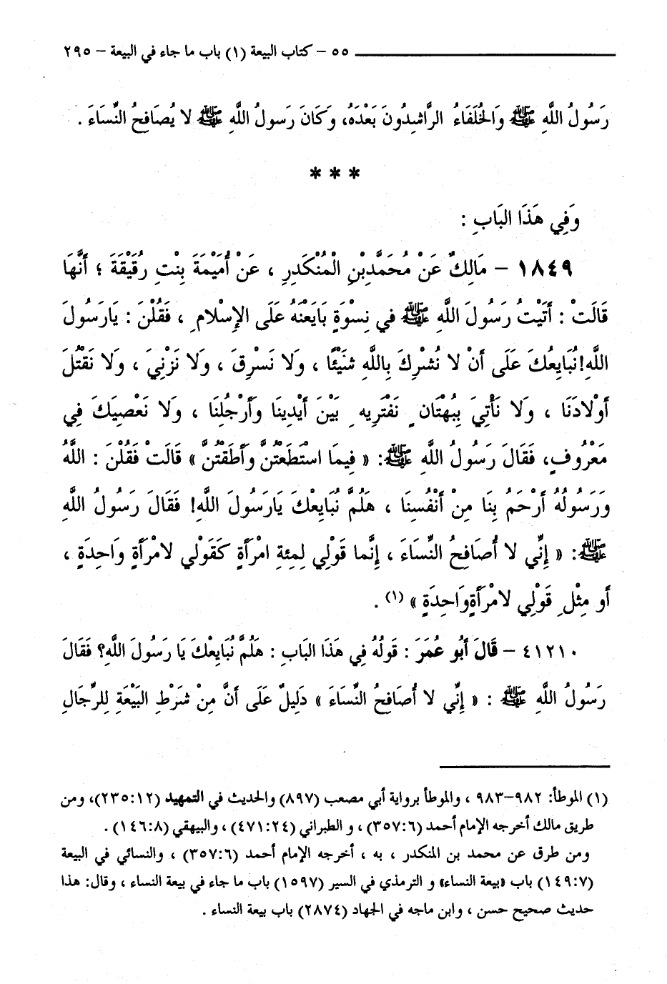 1849 - مَالِكٌ عَنْ مُحَمَّدِ بْنِ الْمُنْكَدِرِ، عَنْ أُمَيْمَةَ بِنْتِ رُقَيْقَةَ ; أَنَّهَا قَالَتْ: أَتَيْتُ رَسُولَ اللَّهِ - صَلَّى اللَّهُ عَلَيْهِ وَسَلَّمَ - فِي نِسْوَةٍ بَايَعْنَهُ عَلَى الْإِسْلَامِ، فَقُلْنَ: يَا رَسُولَ اللَّهِ نُبَايِعُكَ عَلَى أَنْ لَا نُشْرِكَ بِاللَّهِ شَيْئًا، وَلَا نَسْرِقَ، وَلَا نَزْنِيَ، وَلَا نَقْتُلَ أَوْلَادَنَا، وَلَا نَأْتِيَ بِبُهْتَانٍ نَفْتَرِيهِ بَيْنَ أَيْدِينَا وَأَرْجُلِنَا، وَلَا نَعْصِيَكَ فِي مَعْرُوفٍ، فَقَالَ رَسُولُ اللَّهِ - صَلَّى اللَّهُ عَلَيْهِ وَسَلَّمَ -: " فِيمَا اسْتَطَعْتُنَّ وَأَطَقْتُنَّ " قَالَتْ: فَقُلْنَ: اللَّهُ وَرَسُولُهُ أَرْحَمُ بِنَا مِنْ أَنْفُسِنَا، هَلُمَّ نُبَايِعُكَ يَا رَسُولَ اللَّهِ! فَقَالَ رَسُولُ اللَّهِ - صَلَّى اللَّهُ عَلَيْهِ وَسَلَّمَ -: " إِنِّي لَا أُصَافِحُ النِّسَاءَ، إِنَّمَا قَوْلِي لِمِائَةِ امْرَأَةٍ كَقَوْلِي لِامْرَأَةٍ وَاحِدَةٍ، أَوْ مِثْلُ قَوْلِي لِامْرَأَةٍ وَاحِدَةٍ ".