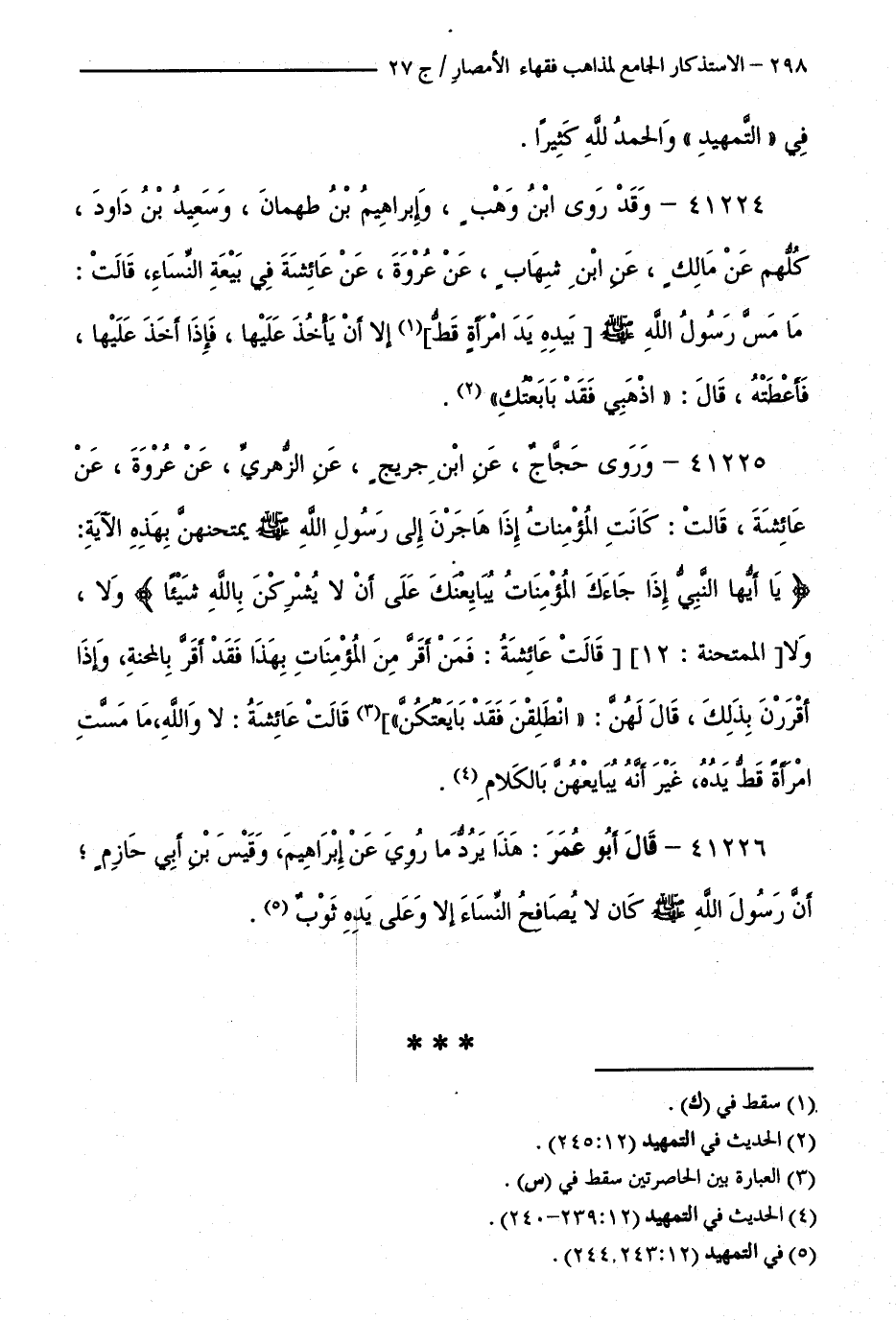 41226 - قَالَ أَبُو عُمَرَ: هَذَا يَرُدُّ مَا رُوِيَ عَنْ إِبْرَاهِيمَ، وَقَيْسِ بْنِ أَبِي حَازِمٍ ; أَنَّ رَسُولَ اللَّهِ - صَلَّى اللَّهُ عَلَيْهِ وَسَلَّمَ - كَانَ لَا يُصَافِحُ النِّسَاءَ إِلَّا وَعَلَى يَدِهِ ثَوْبٌ.