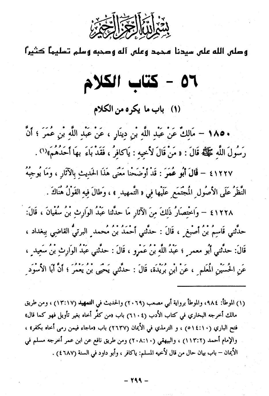 1850 - مَالِكٌ عَنْ عَبْدِ اللَّهِ بْنِ دِينَارٍ، عَنْ عَبْدِ اللَّهِ بْنِ عُمَرَ ; أَنَّ رَسُولَ اللَّهِ - صَلَّى اللَّهُ عَلَيْهِ وَسَلَّمَ - قَالَ: "مَنْ قَالَ لِأَخِيهِ: يَا كَافِرُ، فَقَدْ بَاءَ بِهَا أَحَدُهُمْ ".