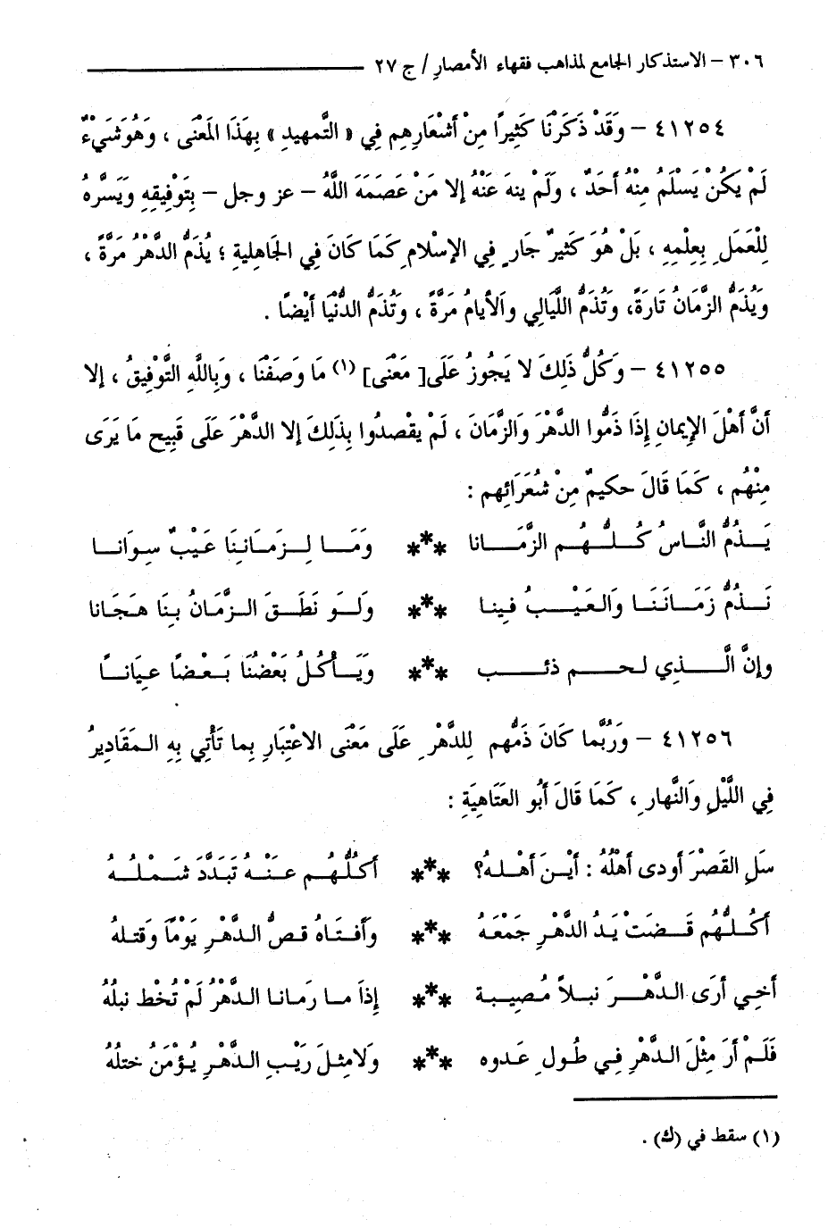 41254 - وَقَدْ ذَكَرْنَا كَثِيرًا مِنْ أَشْعَارِهِمْ فِي " التَّمْهِيدِ " بِهَذَا الْمَعْنَى، وَهُوَ شَيْءٌ لَمْ يَكُنْ يَسْلَمُ مِنْهُ أَحَدٌ، وَلَمْ يَنْهَ عَنْهُ إِلَّا مَنْ عَصَمَهُ اللَّهُ - عَزَّ وَجَلَّ - بِتَوْفِيقِهِ وَيُسْرِهِ لِلْعَمَلِ بِعِلْمِهِ، بَلْ هُوَ كَثِيرٌ جَارٍ فِي الْإِسْلَامِ كَمَا كَانَ فِي الْجَاهِلِيَّةِ ; يُذَمُّ الدَّهْرُ مَرَّةً، وَيُذَمُّ الزَّمَانُ تَارَةً، وَتُذَمُّ اللَّيَالِي وَالْأَيَّامُ مَرَّةً، وَتُذَمُّ الدُّنْيَا أَيْضًا.