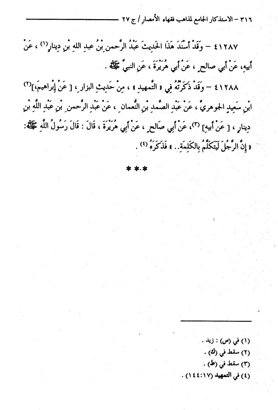 41288 - وَقَدْ ذَكَرْتُهُ فِي " التَّمْهِيدِ " مِنْ حَدِيثِ الْبَزَّارِ، عَنْ إِبْرَاهِيمَ بْنِ سَعِيدٍ الْجَوْهَرِيِّ، عَنْ عَبْدِ الصَّمَدِ بْنِ النُّعْمَانِ، عَنْ عَبْدِ الرَّحْمَنِ بْنِ عَبْدِ اللَّهِ بْنِ دِينَارٍ، عَنْ أَبِيهِ، عَنْ أَبِي صَالِحٍ، عَنْ أَبِي هُرَيْرَةَ، قَالَ: قَالَ رَسُولُ اللَّهِ - صَلَّى اللَّهُ عَلَيْهِ وَسَلَّمَ -: "إِنَّ الرَّجُلَ لَيَتَكَلَّمُ بِالْكَلِمَةِ.... " فَذَكَرَهُ.