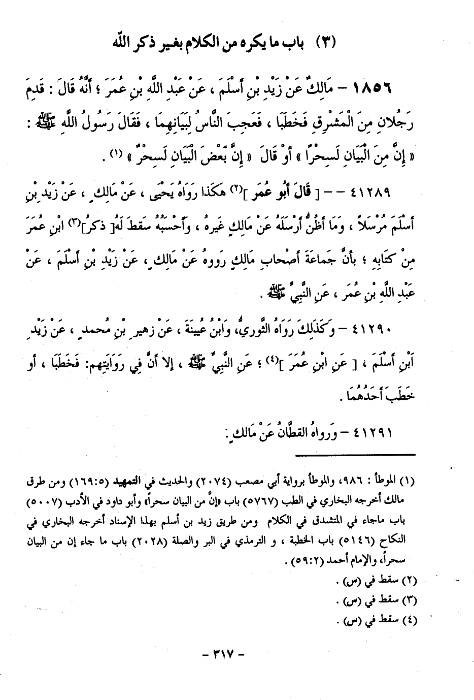 1856 - مَالِكٌ عَنْ زَيْدِ بْنِ أَسْلَمَ، عَنْ عَبْدِ اللَّهِ بْنِ عُمَرَ ; أَنَّهُ قَالَ:قَدِمَ رَجُلَانِ مِنَ الْمَشْرِقِ فَخَطَبَا، فَعَجِبَ النَّاسُ لِبَيَانِهِمَا، فَقَالَ رَسُولُ اللَّهِ - صَلَّى اللَّهُ عَلَيْهِ وَسَلَّمَ -: " إِنَّ مِنَ الْبَيَانِ لَسِحْرًا " أَوْ قَالَ: " إِنَّ بَعْضَ الْبَيَانِ لِسِحْرٌ ".