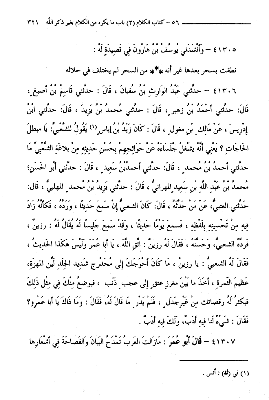 41306 - حَدَّثَنِي عَبْدُ الْوَارِثِ بْنُ سُفْيَانَ، قَالَ: حَدَّثَنِي قَاسِمُ بْنُ أَصْبَغَ، قَالَ: حَدَّثَنِي أَحْمَدُ بْنُ زُهَيْرٍ، قَالَ: حَدَّثَنِي مُحَمَّدُ بْنُ يَزِيدَ، قَالَ: حَدَّثَنِي ابْنُ إِدْرِيسَ، عَنْ مَالِكِ بْنِ مِغْوَلٍ، قَالَ: كَانَ زَيْدُ بْنُ إِيَاسٍ يَقُولُ لِلشَّعْبِيِّ: يَا مُبْطِلَ الْحَاجَاتِ ؟ يَعْنِي أَنْ يَشْغَلَ جُلَسَاءَهُ عَنْ حَوَائِجِهِمْ بِحُسْنِ حَدِيثِهِ مِنْ بَلَاغَةِ الشَّعْبِيِّ، مَا حَدَّثَنِي أَحْمَدُ بْنُ مُحَمَّدٍ، قَالَ: حَدَّثَنِي أَحْمَدُ بْنُ سَعِيدٍ، قَالَ: حَدَّثَنِي أَبُو الْحَسَنِ ; مُحَمَّدُ بْنُ عَبْدِ اللَّهِ بْنِ سَعِيدٍ الْمِهْرَانِيُّ، قَالَ: حَدَّثَنِي يَزِيدُ بْنُ مُحَمَّدٍ الْمُهَلَّبِيُّ، قَالَ: حَدَّثَنِي الْعُتْبِيُّ، عَنْ مَنْ حَدَّثَهُ، قَالَ: كَانَ الشَّعْبِيُّ إِنْ سَمِعَ حَدِيثًا، وَرَدَّهُ، فَكَأَنَّهُ زَادَ فِيهِ مِنْ تَحْسِينِهِ بِلَفْظِهِ، فَسَمِعَ يَوْمًا حَدِيثًا، وَقَدْ سَمِعَ جَلِيسًا لَهُ يُقَالُ لَهُ: رَزِينٌ، فَرَدَّهُ الشَّعْبِيُّ، وَحَسَّنَهُ، فَقَالَ لَهُ رَزِينٌ: اتَّقِ اللَّهَ، يَا أَبَا عُمَرَ وَلَيْسَ هَكَذَا الْحَدِيثُ، فَقَالَ لَهُ الشَّعْبِيُّ: يَا رَزِينُ، مَا كَانَ أَحْوَجَكَ إِلَى مُحَدْرَجٍ شَدِيدِ الْجَلَدِ لَيِّنِ الْمَهَزَّةِ، عَظِيمِ الثَّمَرَةِ، أَخَذَ مَا بَيْنَ مَغْرَزِ عُنُقٍ إِلَى عَجْبِ ذَنَبٍ، فَيُوضَعُ مِنْكَ فِي مِثْلِ ذَلِكَ فَيُكْثِرُ لَهُ رَقَصَاتِكَ مِنْ غَيْرِ جَدَلٍ، فَلَمْ يَدْرِ، مَا قَالَ لَهُ، فَقَالَ: وَمَا ذَاكَ يَا أَبَا عَمْرٍو ؟ فَقَالَ: شَيْءٌ لَنَا فِيهِ أَدَبٌ، وَلَكَ فِيهِ أَدَبٌ.
