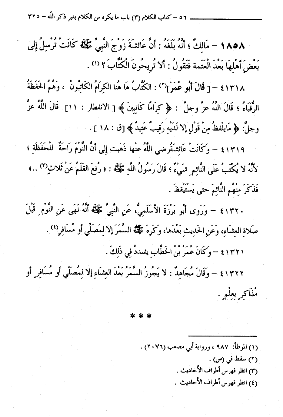1858 - مَالِكٌ ; أَنَّهُ بَلَغَهُ: أَنَّ عَائِشَةَ زَوْجَ النَّبِيِّ - صَلَّى اللَّهُ عَلَيْهِ وَسَلَّمَ - كَانَتْ تُرْسِلُ إِلَى بَعْضِ أَهْلِهَا بَعْدَ الْعَتْمَةِ فَتَقُولُ: أَلَّا تُرِيحُونَ الْكُتَّابَ ؟.