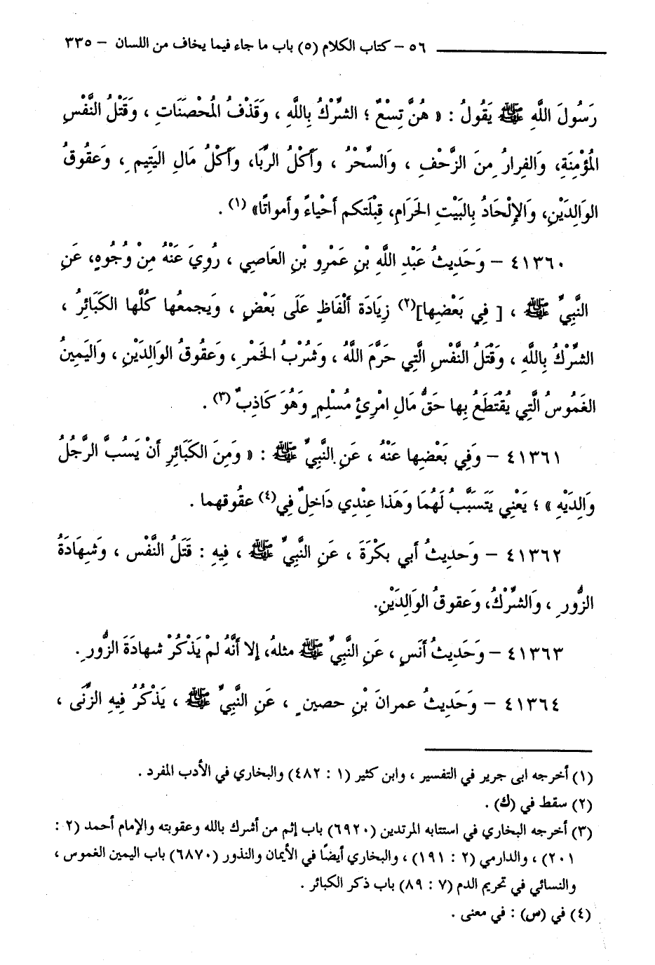 41360 - وَحَدِيثُ عَبْدِ اللَّهِ بْنِ عَمْرِو بْنِ الْعَاصِ، رُوِيَ عَنْهُ مِنْ وُجُوهٍ، عَنِ النَّبِيِّ - صَلَّى اللَّهُ عَلَيْهِ وَسَلَّمَ -، فِي بَعْضِهَا زِيَادَةُ أَلْفَاظٍ عَلَى بَعْضٍ، وَيَجْمَعُهَا كُلُّهَا الْكَبَائِرُ، الشِّرْكُ بِاللَّهِ، وَقَتْلُ النَّفْسِ الَّتِي حَرَّمَ اللَّهُ، وَشُرْبُ الْخَمْرِ، وَعُقُوقُ الْوَالِدَيْنِ، وَالْيَمِينُ الْغَمُوسُ الَّتِي يُقْتَطَعُ بِهَا حَقُّ مَالِ امْرِئٍ مُسْلِمٍ وَهُوَ كَاذِبٌ.