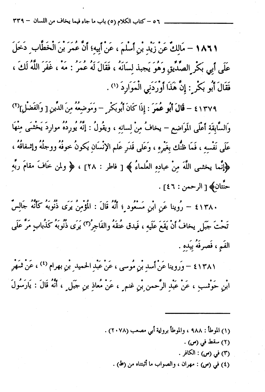 1861 - مَالِكٌ عَنْ زَيْدِ بْنِ أَسْلَمَ، عَنْ أَبِيهِ ; أَنَّ عُمَرَ بْنَ الْخَطَّابِ دَخَلَ عَلَى أَبِي بَكْرٍ الصِّدِّيقِ وَهُوَ يَجْبِذُ لِسَانَهُ، فَقَالَ لَهُ عُمَرُ: مَهْ، غَفَرَ اللَّهُ لَكَ، فَقَالَ أَبُو بَكْرٍ: إِنَّ هَذَا أَوْرَدَنِي الْمَوَارِدُ.