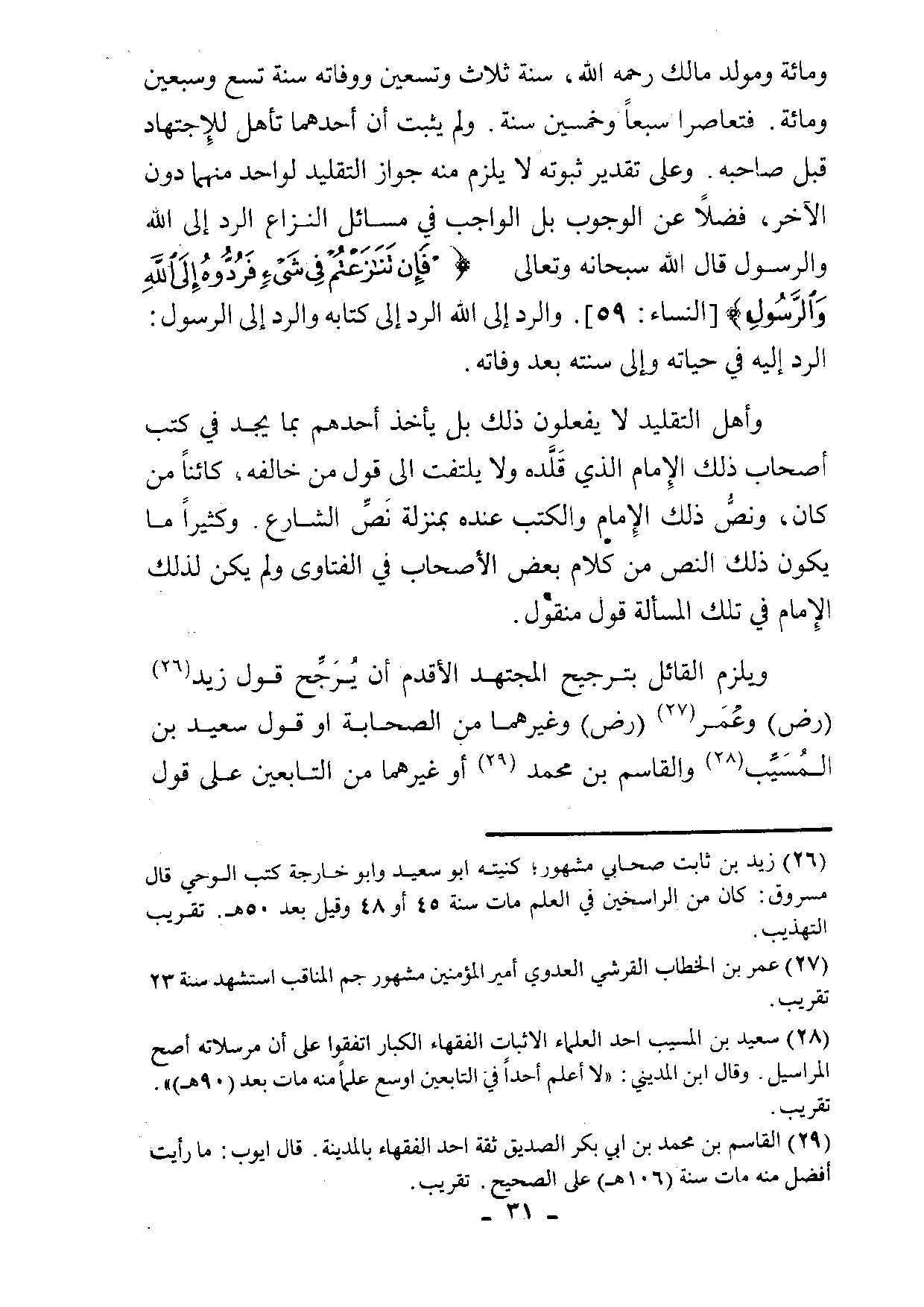 وَمِائَة ومولد مَالك رَحمَه الله سنة ثَلَاث وَتِسْعين ووفاته سنة تسع وَسبعين وَمِائَة فتعاصرا سبعا وَخمسين سنة وَلم يثبت أَن أَحدهمَا تأهل للِاجْتِهَاد قبل صَاحبه وعَلى تَقْدِير ثُبُوته لَا يلْزم مِنْهُ جَوَاز التَّقْلِيد لوَاحِد مِنْهُمَا دون الآخر فضلا عَن الْوُجُوب بل الْوَاجِب فِي مسَائِل النزاع الرَّد إِلَى الله وَالرَّسُول قَالَ الله سُبْحَانَهُ وَتَعَالَى {فَإِن تنازعتم فِي شَيْء فَردُّوهُ إِلَى الله وَالرَّسُول} النِّسَاء 59 وَالرَّدّ إِلَى الله إِلَى كِتَابه وَالرَّدّ إِلَى الرَّسُول الرَّد إِلَيْهِ فِي حَيَاته وَإِلَى سنته بعد وَفَاته