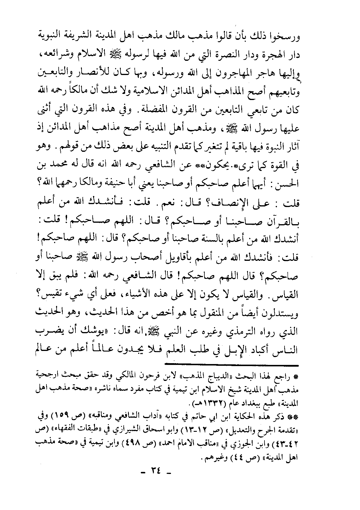 ورسخوا ذَلِك بِأَن قَالُوا مَذْهَب مَالك مَذْهَب أهل الْمَدِينَة الشَّرِيفَة النَّبَوِيَّة دَار الْهِجْرَة وَدَار النُّصْرَة الَّتِي من الله فِيهَا لرَسُوله صلى الله عَلَيْهِ وَسلم الاسلام وشرائعه وإليها هَاجر الْمُهَاجِرُونَ إِلَى الله وَرَسُوله وَبهَا كَانَ للْأَنْصَار وَالتَّابِعِينَ وتابعيهم أصح الْمذَاهب أهل الْمَدَائِن الاسلامية وَلَا شكّ أَن مَالِكًا رَحمَه الله كَانَ من تَابِعِيّ التَّابِعين من الْقُرُون المفضلة وفلي هَذِه الْقُرُون الَّتِي أثنى عَلَيْهَا رَسُول الله صلى الله عَلَيْهِ وَسلم وَمذهب أهل الْمَدِينَة أصح مَذَاهِب أهل الْمَدَائِن إِذْ آثَار النُّبُوَّة فِيهَا بَاقِيَة لم تَتَغَيَّر كَمَا تقدم التَّنْبِيه على بعض ذَلِك من قَوْلهم وَهُوَ فِي الْقُوَّة كَمَا ترى يحكون عَن الشَّافِعِي رَحمَه الله أَنه قَالَ لَهُ مُحَمَّد بن الْحسن أَيهمَا أعلم صَاحبكُم أَو صاحبنا يَعْنِي أَبَا حنيفَة ومالكا رحمهمَا الله قلت على الْإِنْصَاف قَالَ نعم قلت فأنشدك الله من أعلم بِالْقُرْآنِ صاحبنا أَو صَاحبكُم قَالَ اللَّهُمَّ صَاحبكُم قلت أنْشدك الله من أعلم بِالسنةِ صاحبنا أَو صَاحبكُم قَالَ اللَّهُمَّ صَاحبكُم قلت فأنشدك الله من أعلم بأقاويل أَصْحَاب رَسُول الله صلى الله عَلَيْهِ وَسلم صاحبنا أَو صَاحبكُم قَالَ اللَّهُمَّ صَاحبكُم قَالَ الشَّافِعِي رَحمَه الله فَلم يبْق إِلَّا الْقيَاس وَالْقِيَاس لَا يكون إِلَّا على هَذِه الْأَشْيَاء فعلى أَي شَيْء تقيس ويستدلون أَيْضا من الْمَنْقُول بِمَا هُوَ أخص من هَذَا الحَدِيث وَهُوَ الحَدِيث الَّذِي رَوَاهُ التِّرْمِذِيّ وَغَيره عَن النَّبِي صلى الله عَلَيْهِ وَسلم أَنه قَالَ (يُوشك أَن يضْرب النَّاس أكباد الْإِبِل فِي طلب الْعلم فَلَا يَجدونَ عَالما أعلم من عَالم