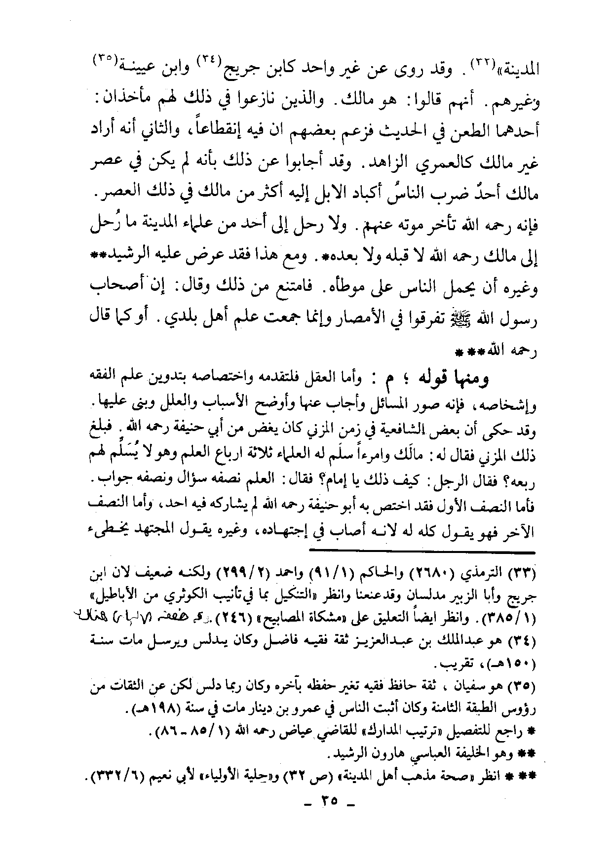 الْمَدِينَة) وَقد روى عَن غير وَاحِد كَابْن جريج وَابْن عُيَيْنَة وَغَيرهم أَنهم قَالُوا هُوَ مَالك وَالَّذين نازعوا فِي ذَلِك لَهُم مأخذان أَحدهمَا الطعْن فِي الحَدِيث فَزعم بَعضهم أَن فِيهِ انْقِطَاعًا وَالثَّانِي أَنه أَرَادَ غير مَالك كالعمري الزَّاهِد وَقد أجابوا عَن ذَلِك بِأَنَّهُ لم يكن فِي عصر مَالك أحد ضرب النَّاس أكباد الْإِبِل إِلَيْهِ أَكثر من مَالك فِي ذَلِك الْعَصْر فَإِنَّهُ رَحمَه الله تَأَخّر مَوته عَنْهُم وَلَا رَحل إِلَى أحد من عُلَمَاء الْمَدِينَة مَا رَحل إِلَى مَالك رَحمَه الله لَا قبله وَلَا بعده وَمَعَ هَذَا فقد عرض عَلَيْهِ الرشيد وَغَيره أَن يحمل النَّاس على موطأه فَامْتنعَ من ذَلِك وَقَالَ إِن أَصْحَاب رَسُول الله صلى الله عَلَيْهِ وَسلم تفَرقُوا فِي الْأَمْصَار وَإِنَّمَا جمعت علم أهل بلدي أَو كَمَا قَالَ رَحمَه الله