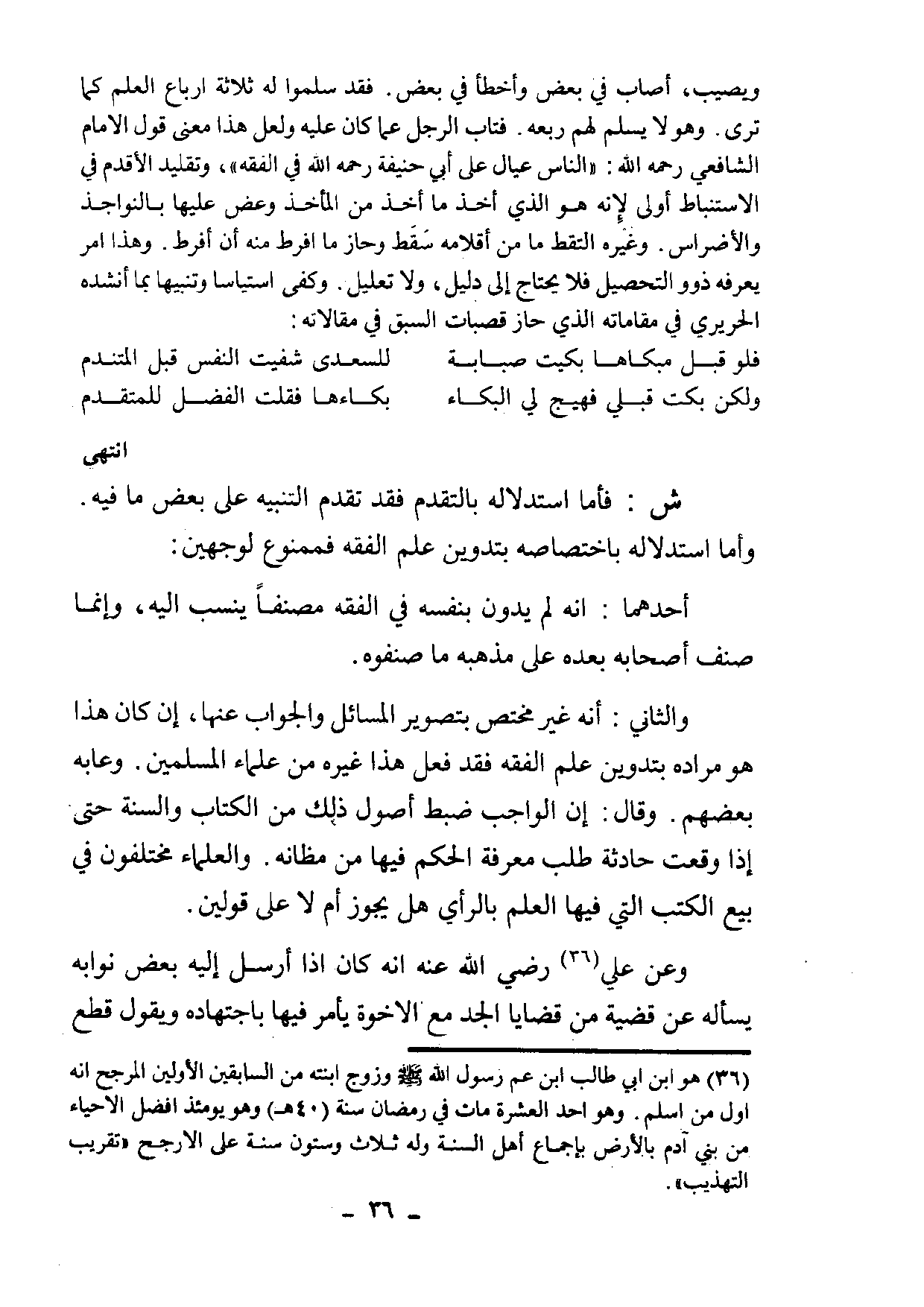 ويصيب أصَاب فِي بعض وَأَخْطَأ فِي بعض فقد سلمُوا لَهُ ثَلَاثَة أَربَاع الْعلم كَمَا ترى وَهُوَ لَا يسلم لَهُم ربعه فَتَابَ الرجل عَمَّا كَانَ عَلَيْهِ وَلَعَلَّ هَذَا معنى قَول الإِمَام الشَّافِعِي رَحمَه الله النَّاس عِيَال على أبي حنيفَة رَحمَه الله فِي الْفِقْه وتقليد الأقدم فِي الاستنباط أولى لِأَنَّهُ هُوَ الَّذِي أَخذ مَا أَخذ من المآخذ وعض عَلَيْهَا بالنواجذ والأضراس وَغَيره الْتقط مَا من أقلامه سقط وَحَازَ مَا افرط مِنْهُ أَن أفرط وَهَذَا أَمر يعرفهُ ذَوُو التَّحْصِيل فَلَا يحْتَاج إِلَى دَلِيل وَلَا تَعْلِيل وَكفى استياسا وتنبيها بِمَا أنْشدهُ الحريري فِي مقاماته الَّذِي حَاز قصبات السَّبق فِي مقالاته