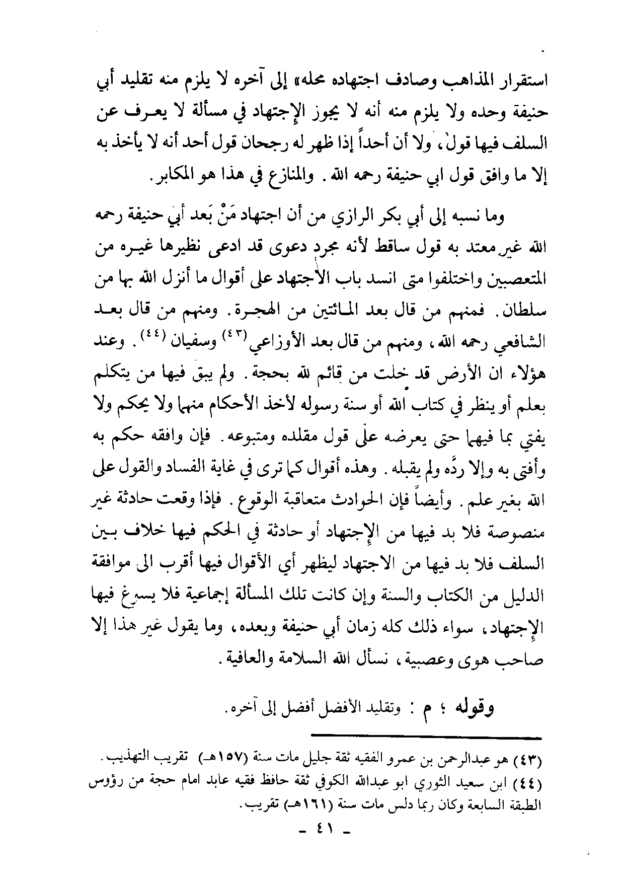 اسْتِقْرَار الْمذَاهب وصادف اجْتِهَاده مَحَله إِلَى آخِره لَا يلْزم مِنْهُ تَقْلِيد أبي حنيفَة وَحده وَلَا يلْزم مِنْهُ أَنه لَا يجوز الإجتهاد فِي مَسْأَلَة لَا يعرف عَن السّلف فِيهَا قَول وَلَا أَن أحدا إِذا ظهر لَهُ رُجْحَان قَول أحد أَنه لَا يَأْخُذ بِهِ إِلَّا مَا وَافق قَول أبي حنيفَة رَحمَه الله والمنازع فِي هَذَا هُوَ المكابر