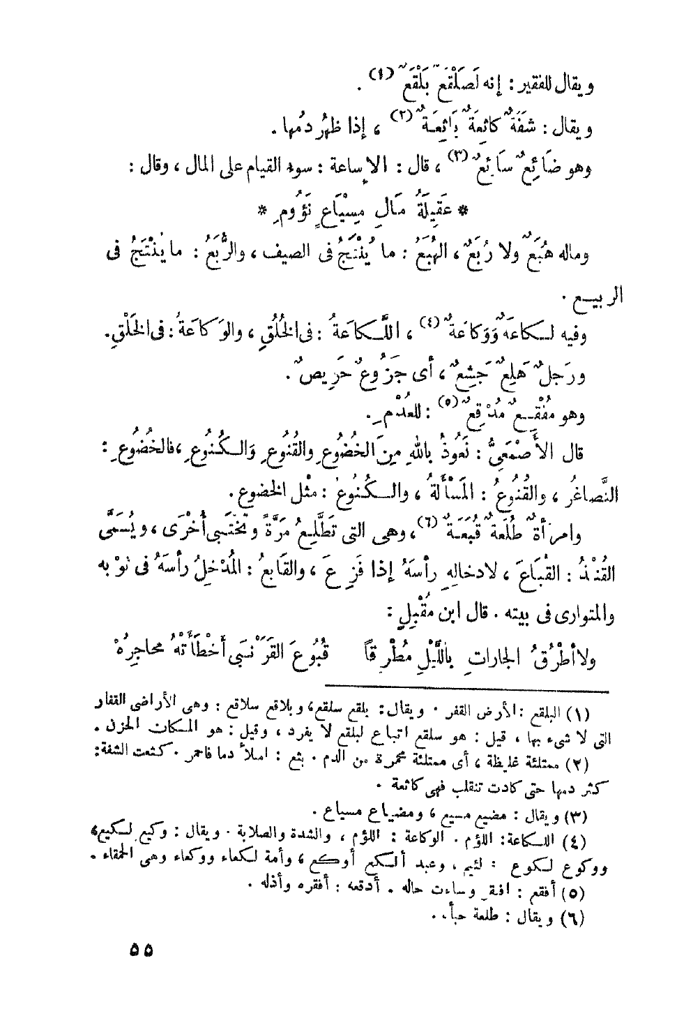 وماله هُبَعٌ ولا رُبَعُ، الهُبَعُ: ما يُنْتَجُ في الصَّيْفِ، والرُّبَعُ: ما يُنْتَجُ في الربيع. وفيهِ لَكَاعَةٌ وَوكَاعَةٌ، اللكاعةُ: في الخُلُقِ، والوَكَاعَةُ: في الخَلْقِ. ورجُلٌ هَلعٌ جَشِعٌ، أي جزوع حريص. وهو مفقع مدقع: للعدم. قال الأصمعيُّ: نعوذُ باللهِ من الخُضوعِ والقُنُوعِ والكنوع، فالخضوع: النصاغر، والقُنوعُ: المَسْأَلَةُ، والكُنوعُ: مِثْلُ الخُضوعِ.