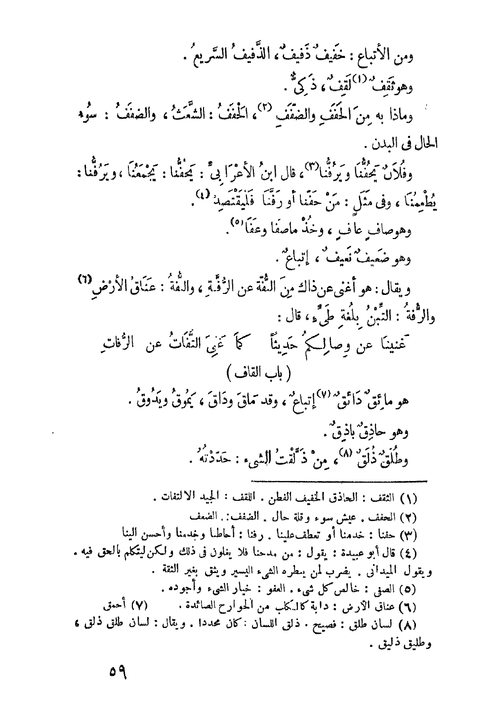 وفلانٌ يَحُفُّنا ويَرُفُّنا، قال ابنُ الأعرابيّ: يحفُّنا: يَجْمَعُنُا، ويَرُفَّنا: يُطْعِمُنَا، وفي مَثَلٍ: مَنْ حَفَّنا أو رفنا فليقتصد. وهو صاف عاف، وخذ ماصفا وعَفَا. وهو ضَعيفٌ نَعِيفٌ، إتباعٌ.