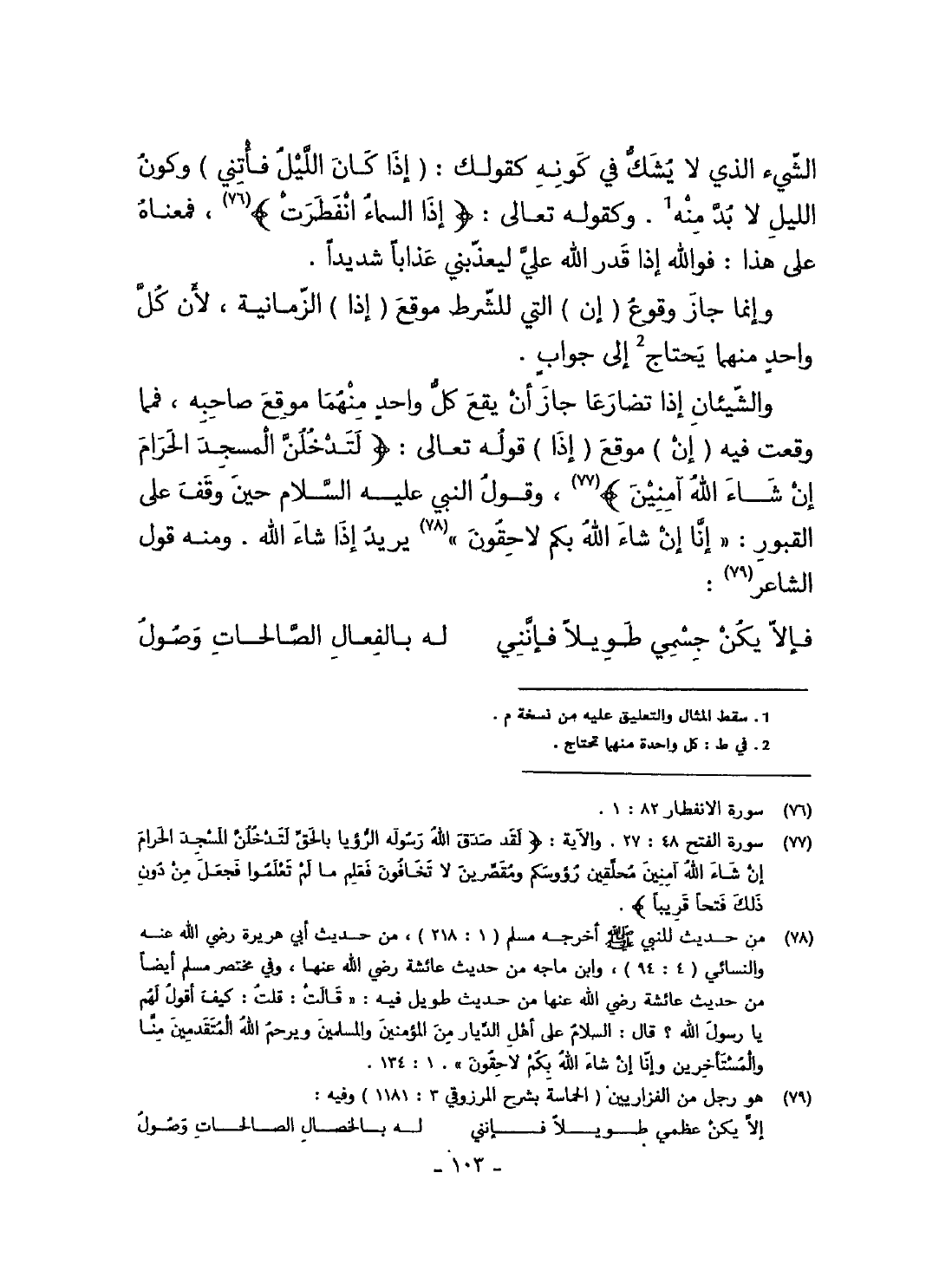 والشيئان اذا تضارعا جَازَ أَن يَقع كل وَاحِد مِنْهُمَا موقع صَاحبه فمما وَقعت فِيهِ ان موقع اذا قَوْله تَعَالَى {لتدخلن الْمَسْجِد الْحَرَام إِن شَاءَ الله آمِنين} وَقَول النَّبِي عَلَيْهِ السَّلَام حِين وقف على الْقُبُور انا ان شَاءَ الله بكم لاحقون يُرِيد اذا شَاءَ الله وَمِنْه قَول الشَّاعِر ... فالا يكن جسمي طَويلا فإنني ... لَهُ بالفعال الصَّالِحَات وُصُول ...