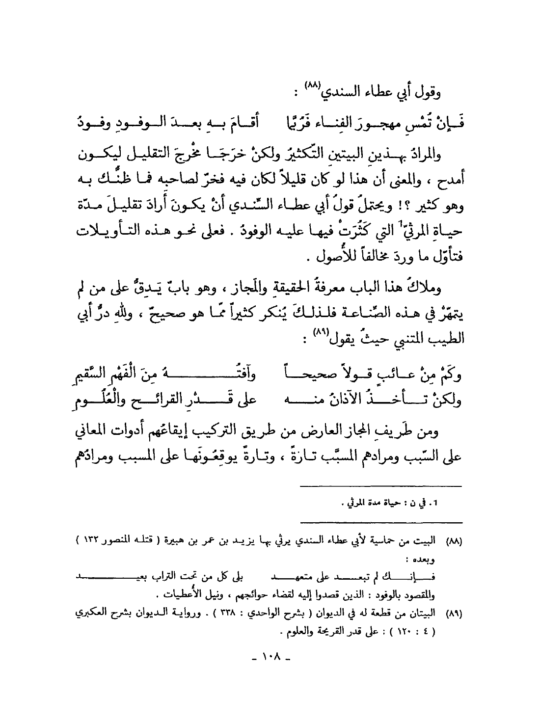 وَالْمرَاد بِهَذَيْنِ الْبَيْتَيْنِ التكثير وَلَكِن خرجا مخرج التقليل ليَكُون أمدح وَالْمعْنَى أَن هَذَا لَو كَانَ قَلِيلا لَكَانَ فِيهِ فَخر لصَاحبه فَمَا ظَنك بِهِ وَهُوَ كثير وَيحْتَمل قَول أبي عَطاء السندي أَن يكون أَرَادَ تقليل مُدَّة حَيَاة المرثي الَّتِي كثرت فِيهَا عَلَيْهِ الْوُفُود فعلى نَحْو هَذِه التأويلات فتأول مَا ورد مُخَالفا لِلْأُصُولِ