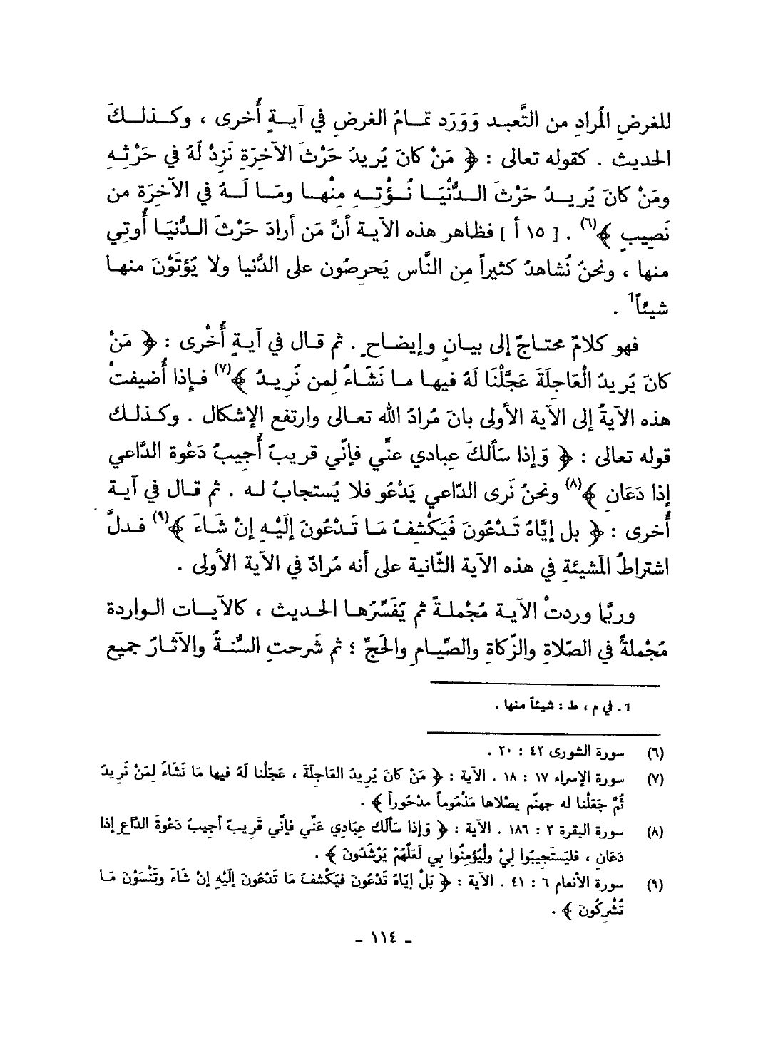 للغرض المُرَاد من التَّعَبُّد وَورد تَمام الْغَرَض فِي آيَة أُخْرَى وَكَذَلِكَ الحَدِيث كَقَوْلِه تَعَالَى {من كَانَ يُرِيد حرث الْآخِرَة نزد لَهُ فِي حرثه وَمن كَانَ يُرِيد حرث الدُّنْيَا نؤته مِنْهَا وَمَا لَهُ فِي الْآخِرَة من نصيب} 15 أفظاهر هَذِه الْآيَة أَن من أَرَادَ حرث الدُّنْيَا أُوتِيَ مِنْهَا وَنحن نشاهد كثيرا من النَّاس يحرصون على الدُّنْيَا وَلَا يُؤْتونَ مِنْهَا شَيْئا