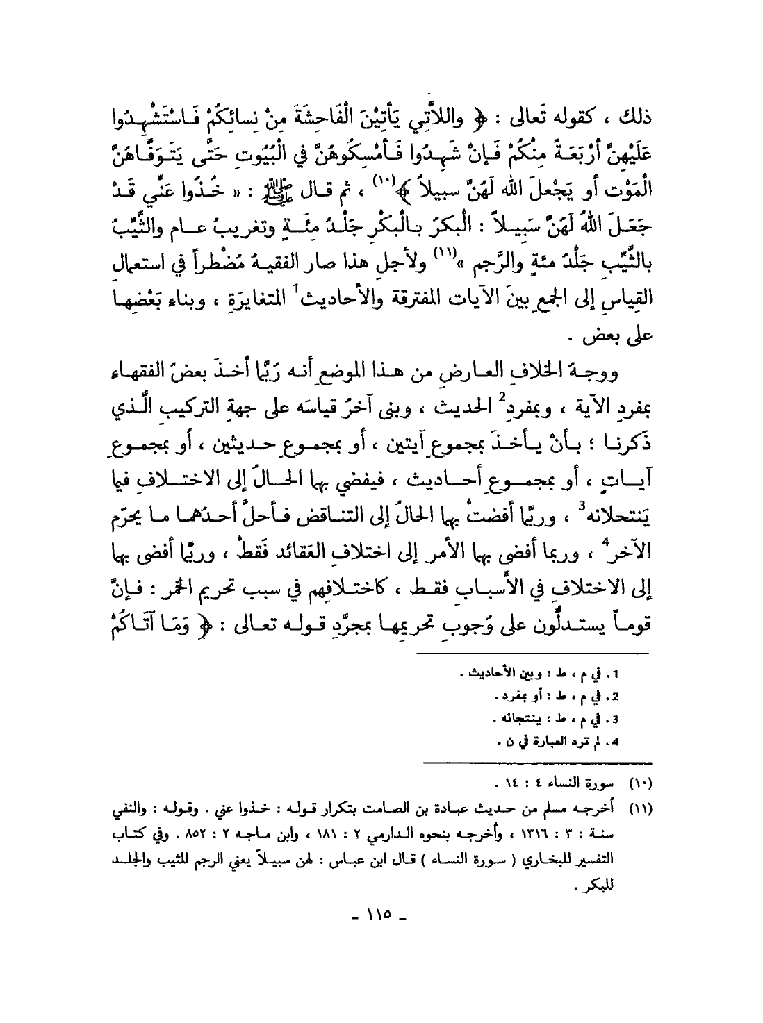 ذَلِك كَقَوْلِه تَعَالَى {واللاتي يَأْتِين الْفَاحِشَة من نِسَائِكُم فاستشهدوا عَلَيْهِنَّ أَرْبَعَة مِنْكُم فَإِن شهدُوا فأمسكوهن فِي الْبيُوت حَتَّى يتوفاهن الْمَوْت أَو يَجْعَل الله لَهُنَّ سَبِيلا} ثمَّ قَالَ صلى الله عَلَيْهِ وَسلم خُذُوا عني قد جعل الله لَهُنَّ سَبِيلا الْبكر بالبكر جلد مئة وتغريب عَام وَالثَّيِّب بِالثَّيِّبِ جلد مئة وَالرَّجم وَلأَجل هَذَا صَار الْفَقِيه مُضْطَرّا فِي اسْتِعْمَال الْقيَاس الى الْجمع بَين الْآيَات المفترقة وَالْأَحَادِيث المتغايرة وَبِنَاء بَعْضهَا على بعض