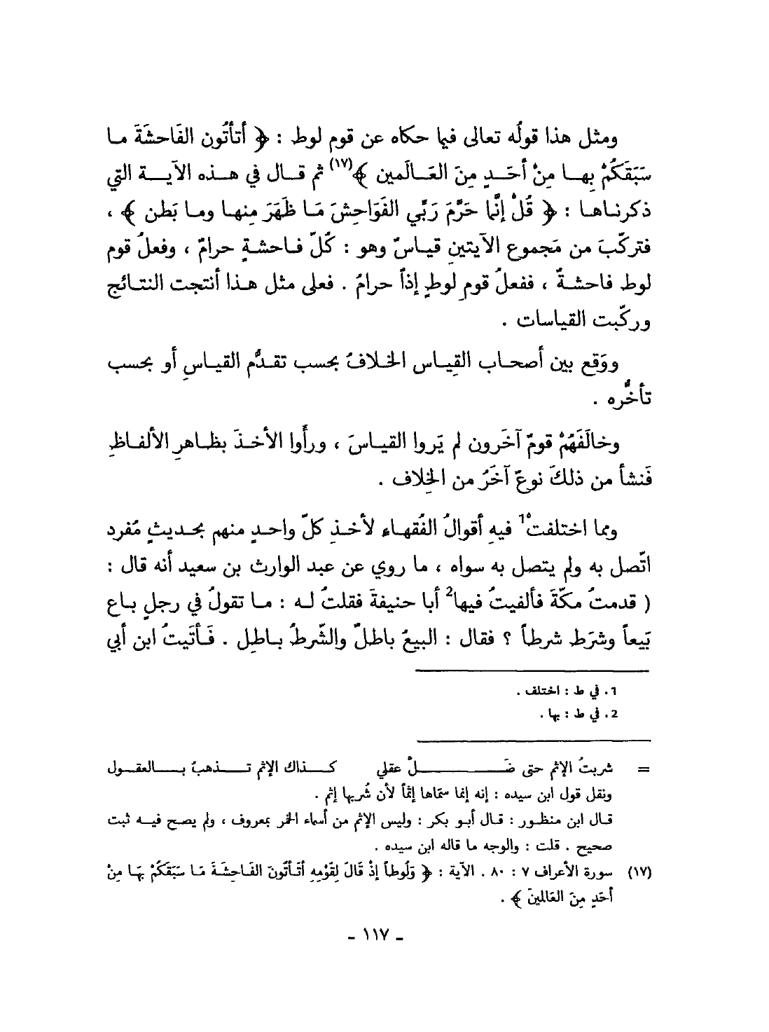 وَمثل هَذَا قَوْله تَعَالَى فِيمَا حَكَاهُ عَن قوم لوط {أتأتون الْفَاحِشَة مَا سبقكم بهَا من أحد من الْعَالمين} ثمَّ قَالَ فِي هَذِه الْآيَة الَّتِي ذَكرنَاهَا {قل إِنَّمَا حرم رَبِّي الْفَوَاحِش مَا ظهر مِنْهَا وَمَا بطن} فتركب من مَجْمُوع الْآيَتَيْنِ قِيَاس وَهُوَ كل فَاحِشَة حرَام وَفعل قوم لوط فَاحِشَة فَفعل قوم لوط اذا حرَام فعلى مثل هَذَا أنتجت النتائج وَركبت القياسات
