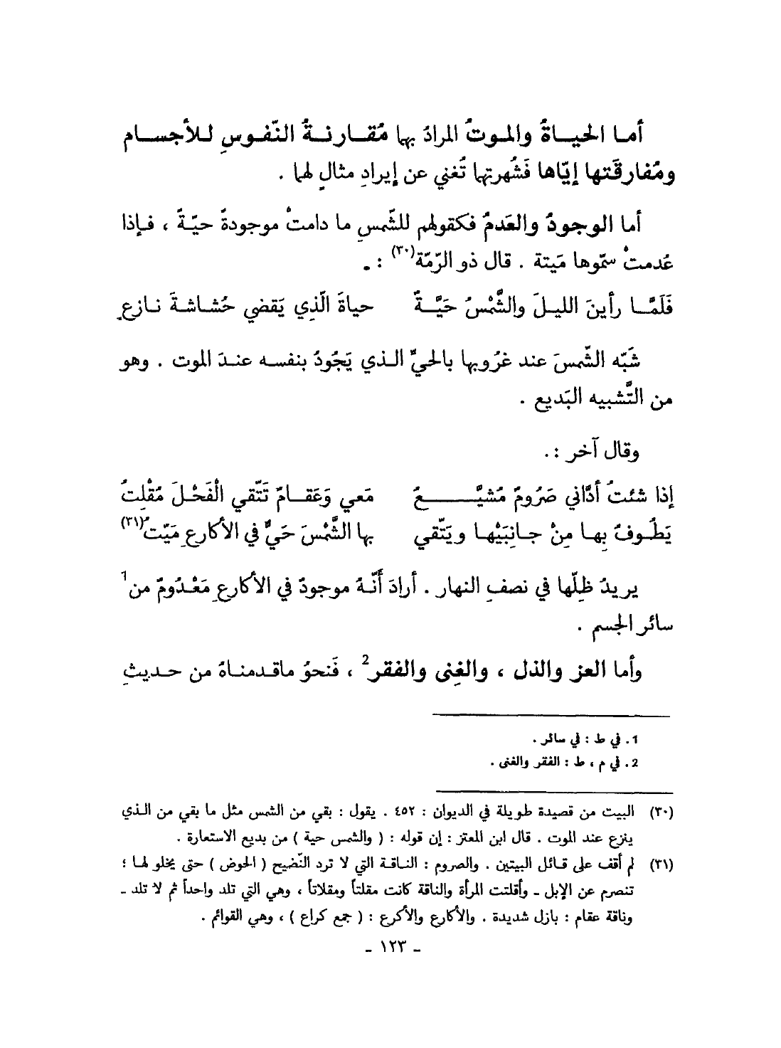 أما الْوُجُود والعدم فكقولهم للشمس مَا دَامَت مَوْجُودَة حَيَّة فاذا عدمت سَموهَا ميتَة قَالَ ذُو الرمة