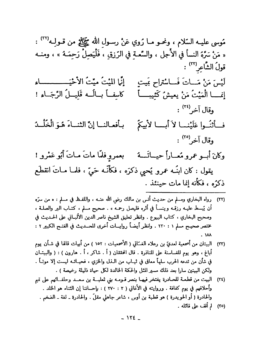 مُوسَى عَلَيْهِ السَّلَام وَنَحْو مَا رُوِيَ عَن رَسُول الله صلى الله عَلَيْهِ وَسلم من قَوْله من سره النسأ فِي الْأَجَل وَالسعَة فِي الرزق فَليصل رَحمَه وَمِنْه قَول الشَّاعِر