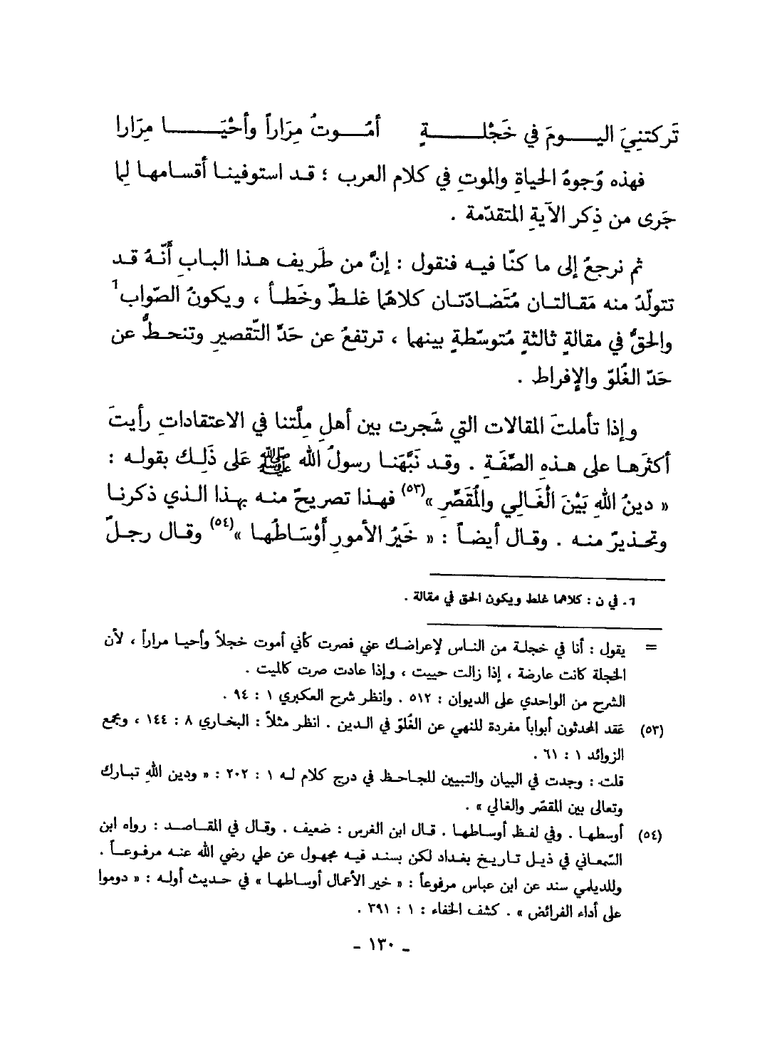 واذا تَأَمَّلت المقالات الَّتِي شجرت بَين أهل ملتنا فِي الاعتقادات رَأَيْت أَكْثَرهَا على هَذَا الصّفة وَقد نبهنا رَسُول الله صلى الله عَلَيْهِ وَسلم على ذَلِك بقوله دين الله بَين الغالي والمقصر فَهَذَا تَصْرِيح مِنْهُ بِهَذَا الَّذِي ذكرنَا وتحذير مِنْهُ وَقَالَ أَيْضا خير الْأُمُور أوساطها وَقَالَ رجل
