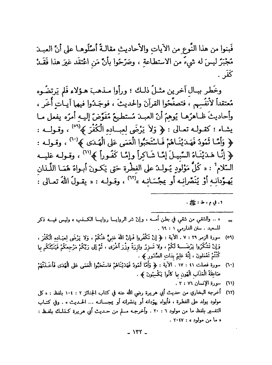 وخطر ببال آخَرين مثل ذَلِك وَرَأَوا مَذْهَب هَؤُلَاءِ فَلم يرتضوه مُعْتَقدًا لأَنْفُسِهِمْ فتصفحوا الْقُرْآن والْحَدِيث فوجدوا فيهمَا آيَات أخر وَأَحَادِيث ظَاهرهَا يُوهم أَن العَبْد مستطيع مفوض اليه أمره يفعل مَا يَشَاء كَقَوْلِه تَعَالَى {وَلَا يرضى لِعِبَادِهِ الْكفْر} وَقَوله {وَأما ثَمُود فهديناهم فاستحبوا الْعَمى على الْهدى} وَقَوله {إِنَّا هديناه السَّبِيل إِمَّا شاكرا وَإِمَّا كفورا} وَقَوله عَلَيْهِ السَّلَام كل مَوْلُود يُولد على الْفطْرَة حَتَّى يكون أَبَوَاهُ هما اللَّذَان يُهَوِّدَانِهِ أَو ينصرَانِهِ أَو يُمَجِّسَانِهِ وَقَوله يَقُول الله تَعَالَى