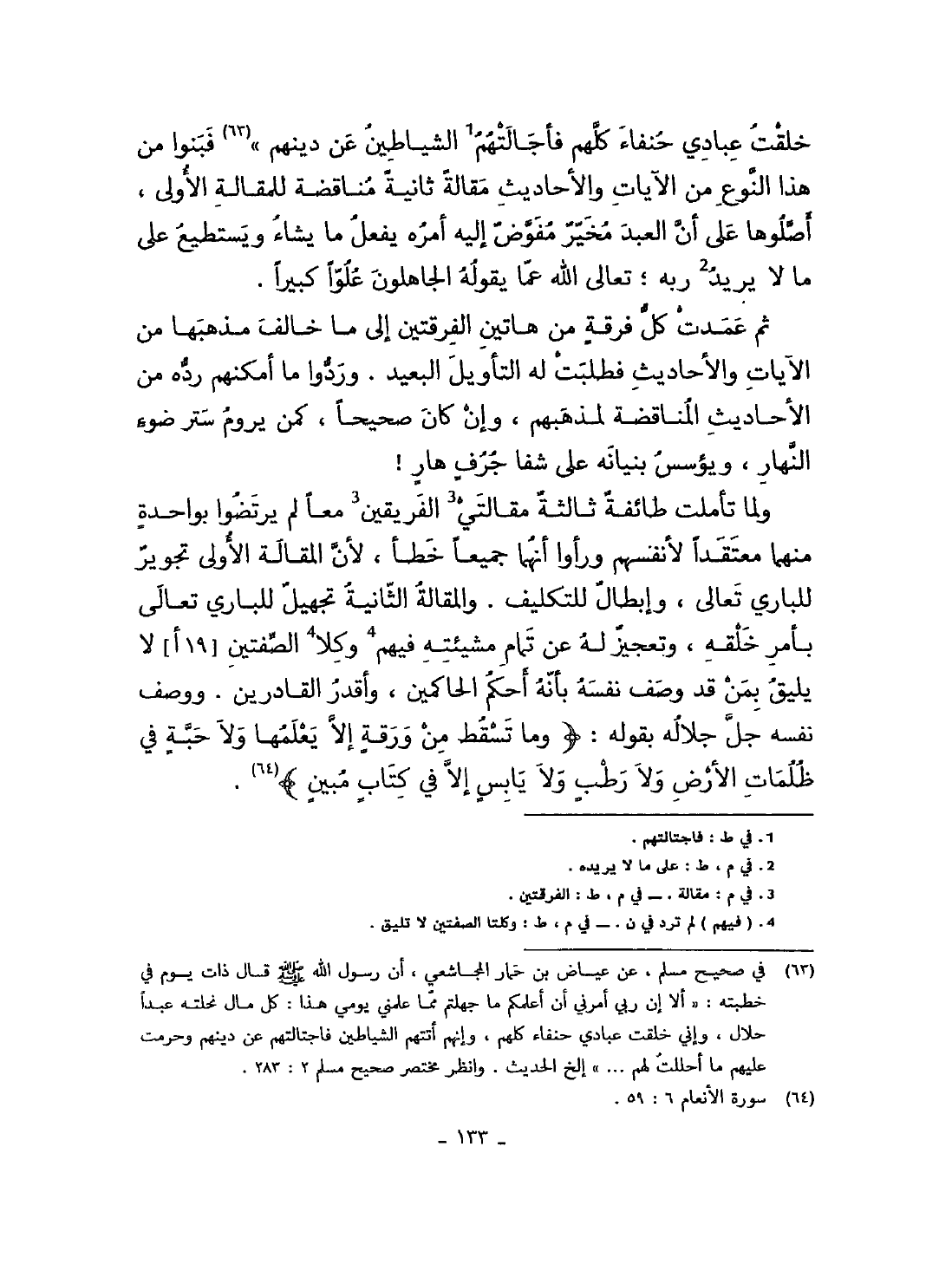خلقت عبَادي حنفَاء كلهم فأجالتهم الشَّيَاطِين عَن دينهم فبنوا من هَذَا النَّوْع من الْآيَات وَالْأَحَادِيث مقَالَة ثَانِيَة مناقضة للمقالة الأولى أصلوها على أَن العَبْد مُخَيّر مفوض اليه أمره يفعل مَا يَشَاء ويستطيع على مَا لَا يُرِيد ربه تَعَالَى الله عَمَّا يَقُوله الجاهلون علوا كَبِيرا