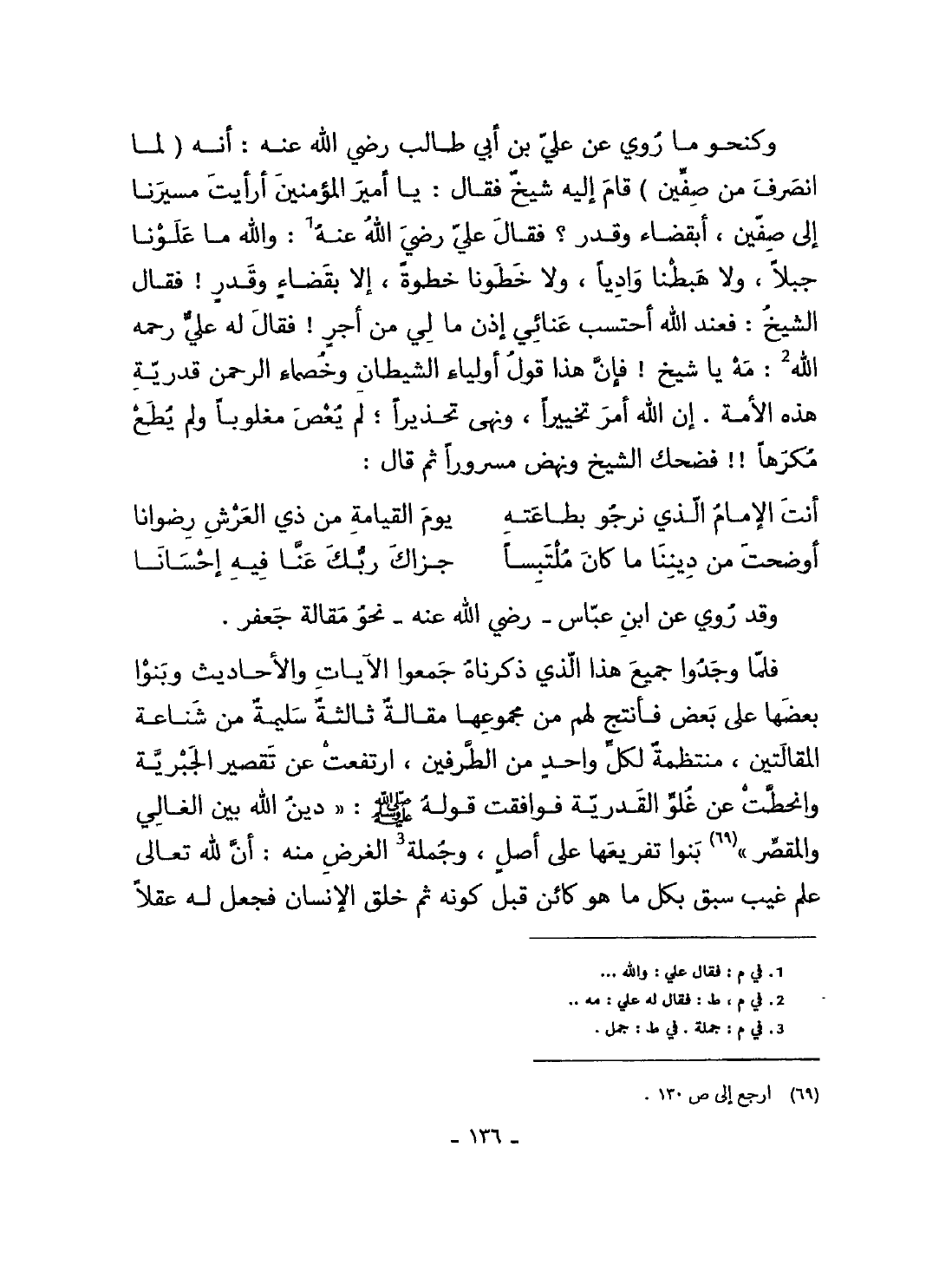 وكنحو مَا رُوِيَ عَن عَليّ بن أبي طَالب رَضِي الله عَنهُ أَنه لما انْصَرف من صفّين قَامَ اليه شيخ فَقَالَ يَا أَمِير الْمُؤمنِينَ أَرَأَيْت مسيرنا الى صفّين أبقضاء وَقدر فَقَالَ عَليّ رَضِي الله عَنهُ وَالله مَا علونا جبلا وَلَا هبطنا وَاديا وَلَا خطونا خطْوَة الا بِقَضَاء وَقدر فَقَالَ الشَّيْخ فَعِنْدَ الله أحتسب عنائي اذن مَا لي من أجر فَقَالَ لَهُ عَليّ رَحمَه الله مَه يَا شيخ فَإِن هَذَا قَول أَوْلِيَاء الشَّيْطَان وخصماء الرَّحْمَن قدرية هَذِه الْأمة ان الله أَمر تخييرا وَنهى تحذيرا لم يعْص مَغْلُوبًا وَلم يطع مكْرها فَضَحِك الشَّيْخ ونهض مَسْرُورا ثمَّ قَالَ