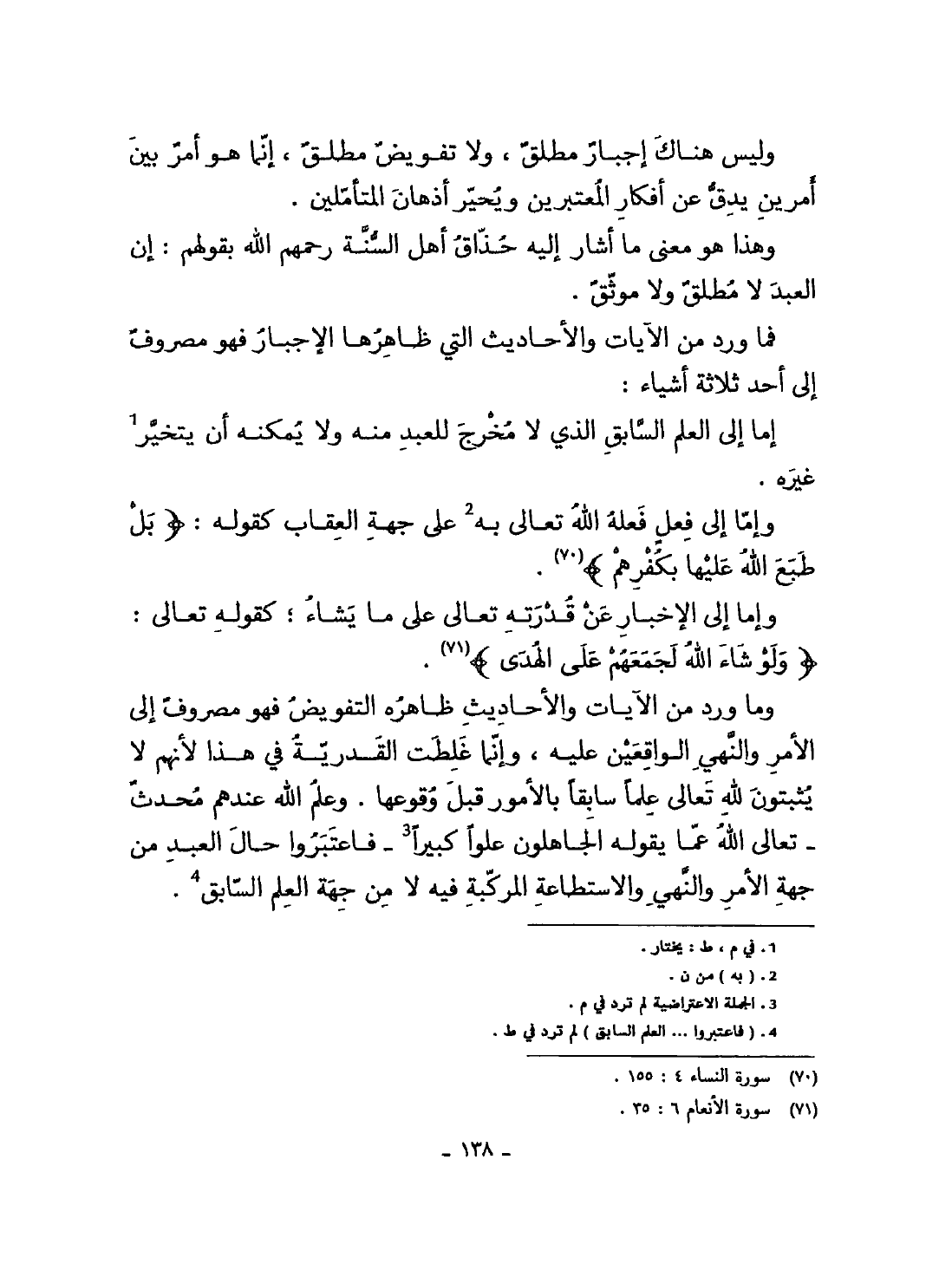 وَمَا ورد من الْآيَات وَالْأَحَادِيث ظَاهره التَّفْوِيض فَهُوَ مَصْرُوف الى الْأَمر وَالنَّهْي الواقعين عَلَيْهِ وانما غَلطت الْقَدَرِيَّة فِي هَذَا لأَنهم لَا يثبتون لله تَعَالَى علما سَابِقًا بالأمور قبل وُقُوعهَا وَعلم الله عِنْدهم مُحدث تَعَالَى الله عَمَّا يَقُوله الجاهلون علوا كَبِيرا فاعتبروا حَال العَبْد من جِهَة الْأَمر وَالنَّهْي والإستطاعة المركبة فِيهِ لَا من جِهَة الْعلم السَّابِق