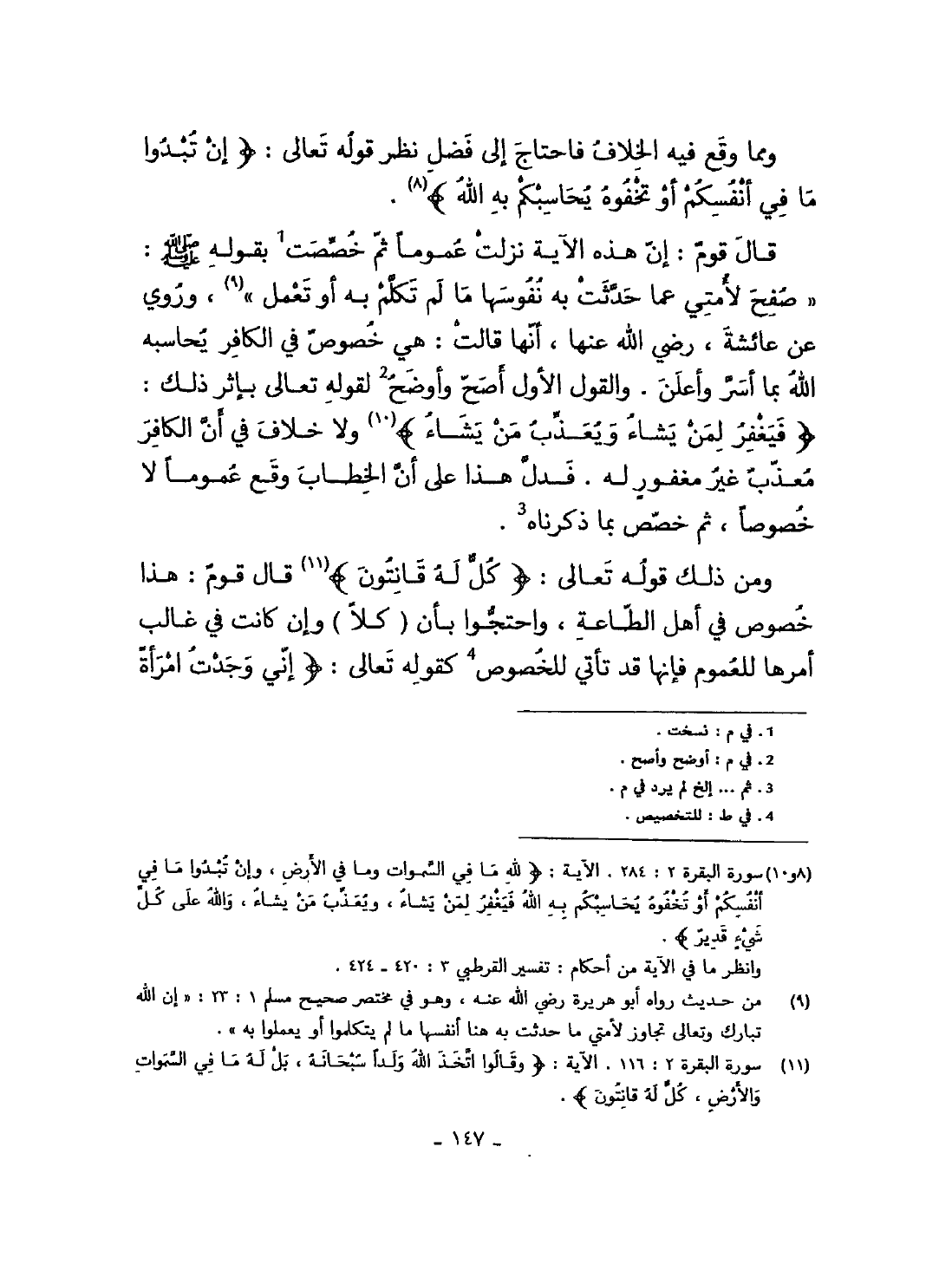 قَالَ قوم ان هَذِه الْآيَة نزلت عُمُوما ثمَّ خصصت بقوله صلى الله عَلَيْهِ وَسلم صفح لأمتي عَمَّا حدثت بِهِ نفوسها مَا لم تكلم بِهِ أَو تعْمل وَرُوِيَ عَن عَائِشَة رَضِي الله عَنْهَا أَنَّهَا قَالَت هِيَ خُصُوص فِي الْكَافِر يحاسبه الله بِمَا أسر وأعلن وَالْقَوْل الأول أصح وأوضح لقَوْله تَعَالَى باثر ذَلِك {فَيغْفر لمن يَشَاء ويعذب من يَشَاء} وَلَا خلاف فِي أَن الْكَافِر معذب غير مغْفُور لَهُ فَدلَّ على أَن الْخطاب وَقع عُمُوما لَا خُصُوصا ثمَّ خصص بِمَا ذَكرْنَاهُ
