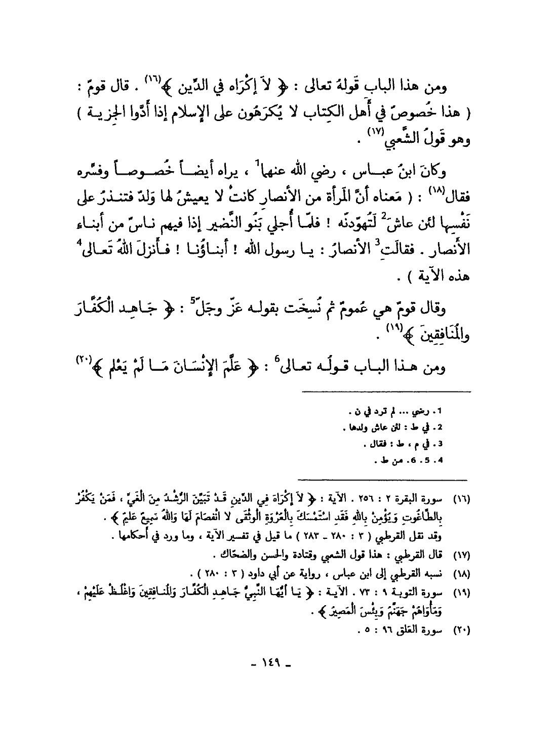 وَمن هَذَا الْبَاب قَوْله تَعَالَى {لَا إِكْرَاه فِي الدّين} قَالَ قوم هَذَا خُصُوص فِي أهل الْكتاب لَا يكْرهُونَ على الْإِسْلَام اذا أدواالجزية وَهُوَ قَول الشّعبِيّ