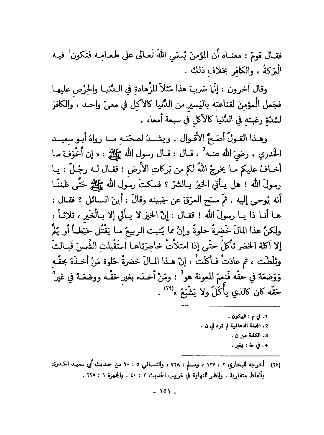 وَهَذَا القَوْل أصح الْأَقْوَال وَيشْهد لصِحَّته مَا رَوَاهُ أَبُو سعيد الْخُدْرِيّ رَضِي الله عَنهُ قَالَ قَالَ رَسُول الله صلى الله عَلَيْهِ وَسلم ان أخوف مَا أَخَاف عَلَيْكُم مَا يخرج الله لكم من بَرَكَات الأَرْض فَقَالَ لَهُ رجل يَا رَسُول الله هَل يَأْتِي الْخَيْر بِالشَّرِّ فَسكت رَسُول الله صلى الله عَلَيْهِ وَسلم حَتَّى ظننا أَنه يُوحى اليه ثمَّ مسح الْعرق عَن جَبينه وَقَالَ أَيْن السَّائِل فَقَالَ هَا أَنا ذَا يَا رَسُول الله فَقَالَ ان الْخَيْر لَا يَأْتِي الا بِالْخَيرِ ثَلَاثًا وَلَكِن هَذَا المَال خضرَة حلوة وان مِمَّا ينْبت الرّبيع مَا يقتل حَبطًا أَو يلم الا آكِلَة الْخضر تَأْكُل حَتَّى اذا امْتَلَأت خاصرتاها اسْتقْبلت الشَّمْس فبالت وثلطت ثمَّ عَادَتْ فَأكلت ان هَذَا المَال خضرَة حلوة من أَخذه بِحقِّهِ وَوَضعه فِي حَقه فَنعم المعونة هُوَ وَمن أَخذه بِغَيْر حَقه وَوَضعه فِي غير حَقه كَانَ كَالَّذي يَأْكُل وَلَا يشْبع