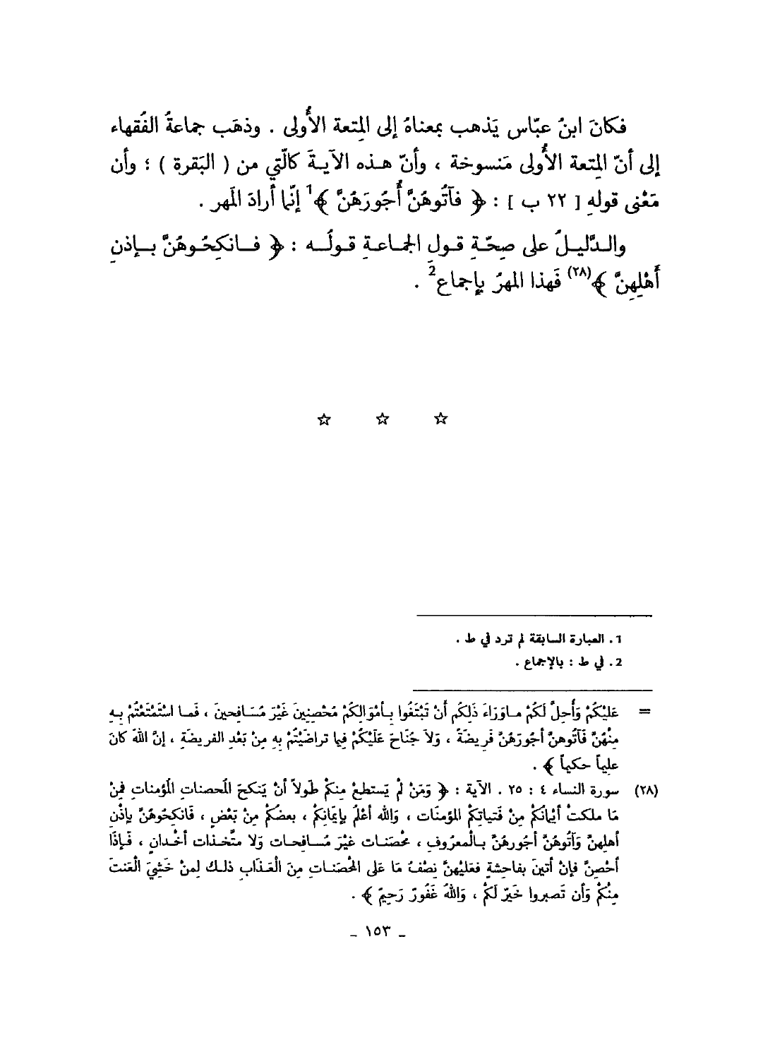 فَكَانَ ابْن عَبَّاس يذهب بِمَعْنَاهُ الى الْمُتْعَة الأولى وَذهب جمَاعَة الْفُقَهَاء الى أَن الْمُتْعَة الأولى مَنْسُوخَة وَأَن هَذِه الْآيَة كَالَّتِي من الْبَقَرَة وَأَن معنى قَوْله 22 ب {فَآتُوهُنَّ أُجُورهنَّ} انما أَرَادَ الْمهْر