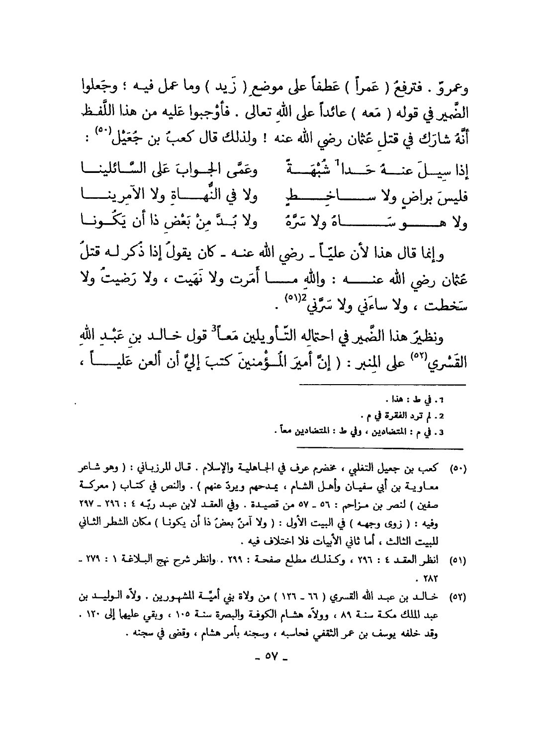 وَنَظِير هَذَا الضَّمِير فِي احْتِمَاله التَّأْويلَيْنِ مَعًا قَول خَالِد بن عبد الله الْقَسرِي على الْمِنْبَر ان أَمِير الْمُؤمنِينَ كتب الي أَن ألعن عليا