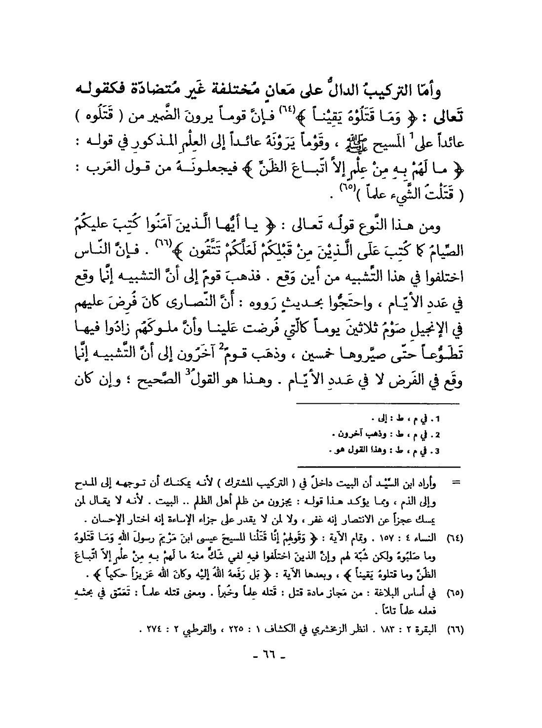 وَمن هَذَا النَّوْع قَوْله تَعَالَى {يَا أَيهَا الَّذين آمنُوا كتب عَلَيْكُم الصّيام كَمَا كتب على الَّذين من قبلكُمْ لَعَلَّكُمْ تَتَّقُون} فَإِن النَّاس اخْتلفُوا فِي هَذَا التَّشْبِيه من أَيْن وَقع فَذهب قوم الى أَن التَّشْبِيه انما وَقع فِي عدد الْأَيَّام وَاحْتَجُّوا بِحَدِيث رَوَوْهُ أَن النَّصَارَى كَانَ فرض عَلَيْهِم فِي الْإِنْجِيل صَوْم ثَلَاثِينَ يَوْمًا كَالَّتِي فرضت علينا وَأَن مُلُوكهمْ زادوا فِيهَا تَطَوّعا حَتَّى صيروها خمسين وَذهب قوم آخَرُونَ الى أَن التَّشْبِيه انما وَقع فِي الْفَرْض لَا فِي عدد الْأَيَّام وَهَذَا هُوَ القَوْل الصَّحِيح وان كَانَ