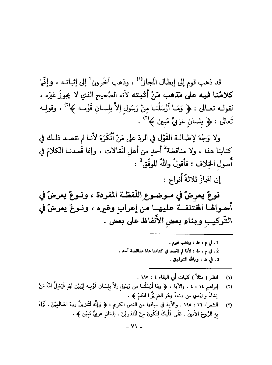 قد ذهب قوم الى ابطال الْمجَاز وَذهب آخَرُونَ الى اثباته وانما كلامنا فِيهِ على مَذْهَب من أثْبته لِأَنَّهُ الصَّحِيح الَّذِي لَا يجوز غَيره لقَوْله تَعَالَى {وَمَا أرسلنَا من رَسُول إِلَّا بِلِسَان قومه} وَقَوله تَعَالَى {بِلِسَان عَرَبِيّ مُبين}