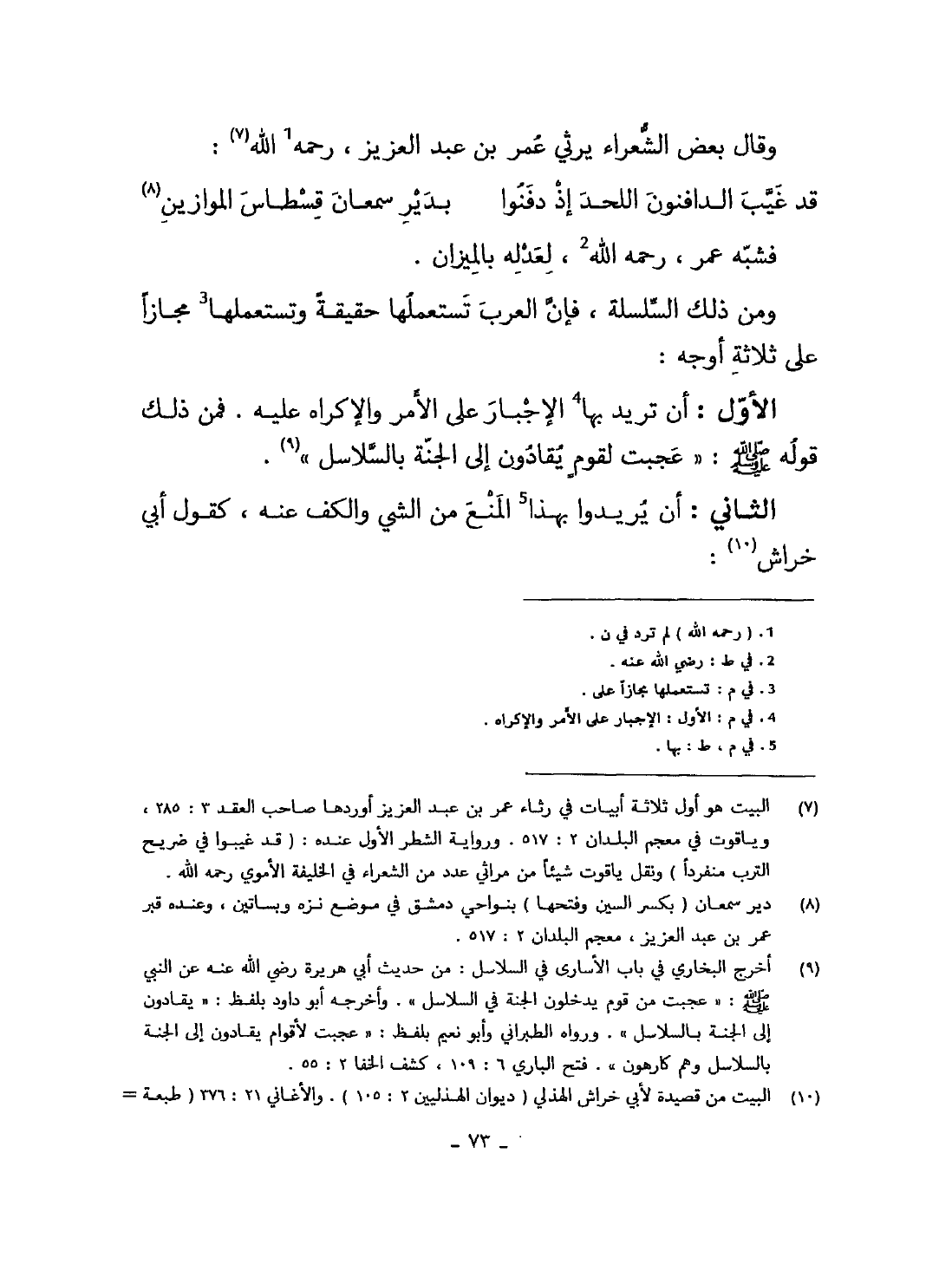 وَمن ذَلِك السلسلة فان الْعَرَب تستعملها حَقِيقَة وتستعملها مجَازًا على ثَلَاثَة أوجه