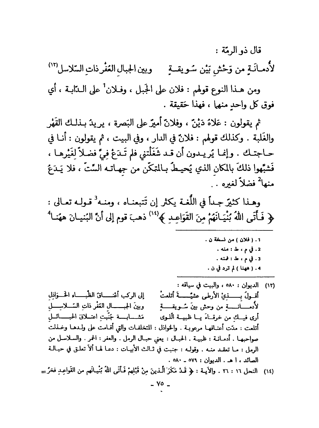 قَالَ ذُو الرمة ... لأدمانة من وَحش بَين سويقة ... وَبَين الْجبَال العفر ذَات السلَاسِل ... وَمن هَذَا النَّوْع قَوْلهم فلَان على الْجَبَل وَفُلَان على الدَّابَّة أَي فَوق كل وَاحِد مِنْهُمَا فَهَذَا حَقِيقَة