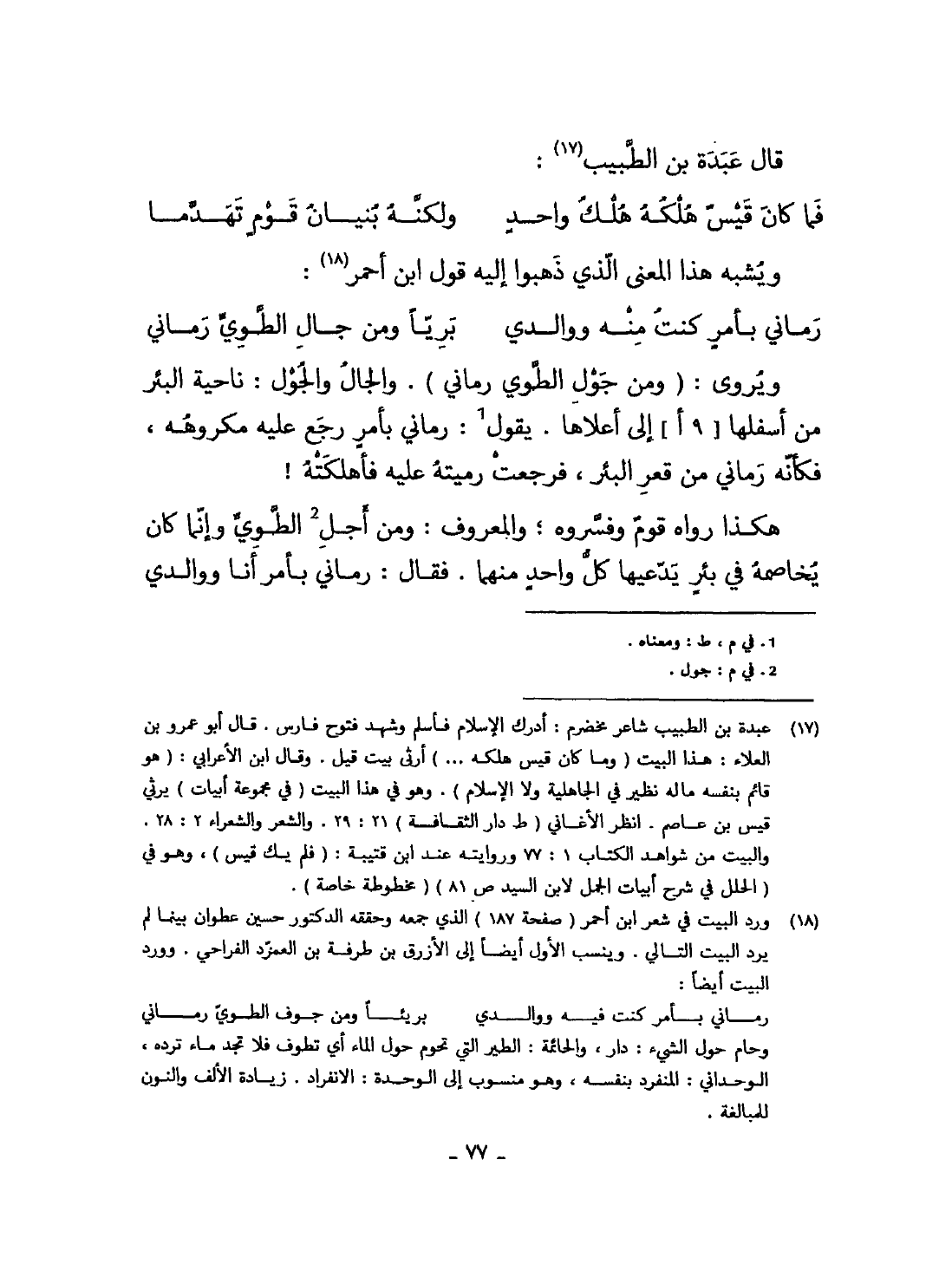 قَالَ عَبدة بن الطَّبِيب ... فَمَا كَانَ قيس هلكه هلك وَاحِد ... وَلكنه بُنيان قوم تهدما ... وَيُشبه هَذَا الْمَعْنى الَّذِي ذَهَبُوا اليه قَول ابْن أَحْمَر ... رماني بِأَمْر كنت مِنْهُ ووالدي ... بريا وَمن جال الطوي رماني ... ويروى وَمن جول الطوي رماني والجال والجول نَاحيَة الْبِئْر من أَسْفَلهَا 9 أالى أَعْلَاهَا يَقُول رماني بِأَمْر رَجَعَ عَلَيْهِ مكروهه فَكَأَنَّهُ رماني من قَعْر الْبِئْر فَرَجَعت رميته عَلَيْهِ فأهلكته
