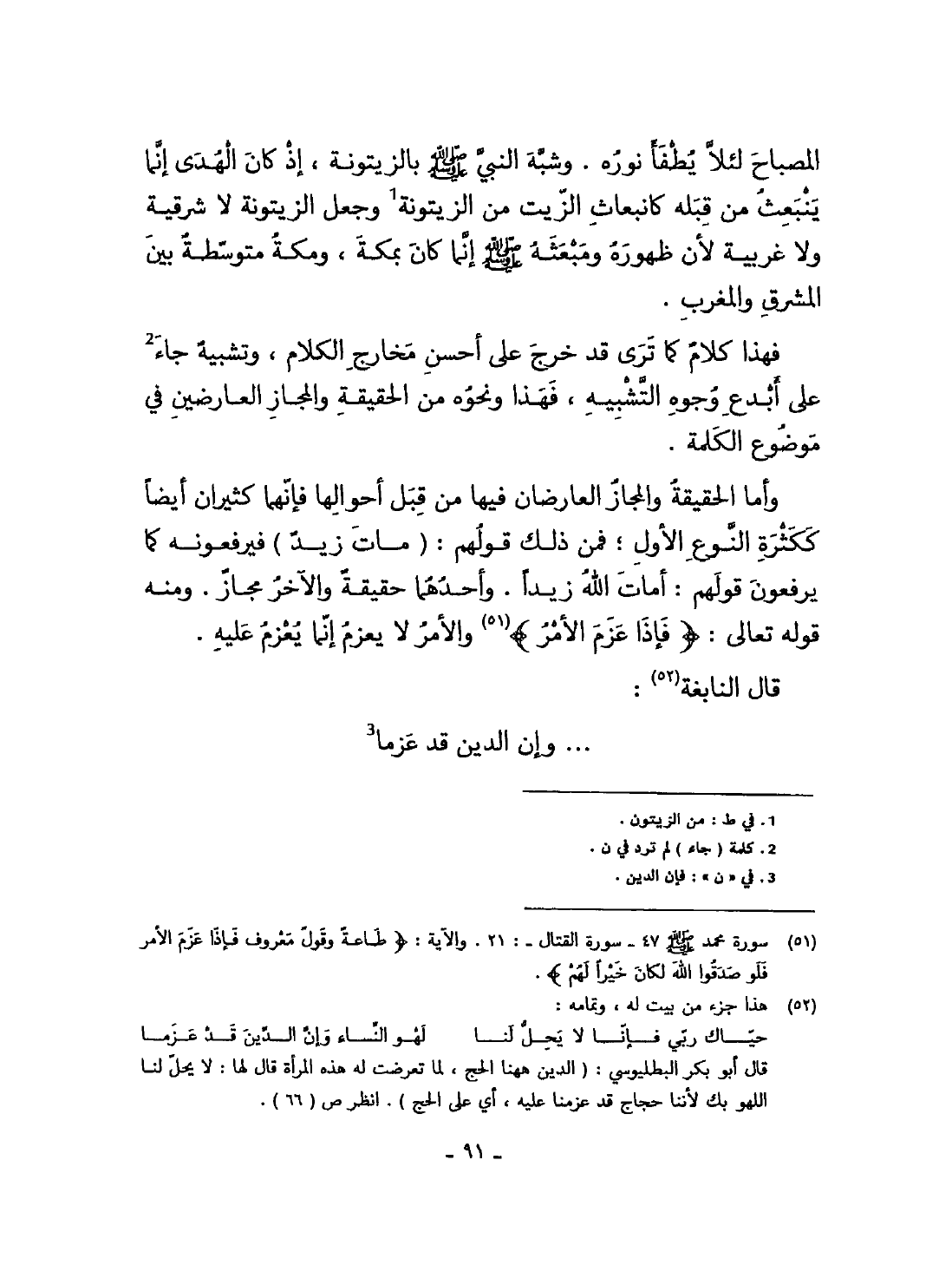 فَهَذَا كَلَام كَمَا ترى قد خرج على أحسن مخارج الْكَلَام وتشبيه جَاءَ على أبدع وُجُوه التَّشْبِيه فَهَذَا وَنَحْوه من الْحَقِيقَة وَالْمجَاز العارضين فِي مَوْضُوع الْكَلِمَة