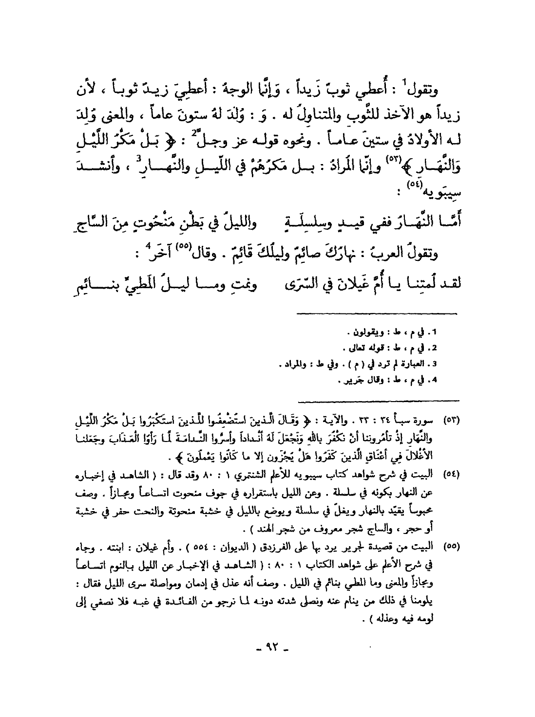 وَتقول أعطي ثوب زيدا وانما الْوَجْه أعطي زيد ثوبا لِأَن زيدا هُوَ والآخذ للثوب والمتناول لَهُ وَولد لَهُ سِتُّونَ عَاما وَالْمعْنَى ولد لَهُ الْأَوْلَاد فِي سِتِّينَ عَاما وَنَحْوه قَوْله عز وَجل {بل مكر اللَّيْل وَالنَّهَار} وانما المُرَاد بل مَكْرهمْ فِي اللَّيْل وَالنَّهَار وَأنْشد سِيبَوَيْهٍ ... أما النَّهَار فَفِي قيد وسلسلة ... وَاللَّيْل فِي بطن منحوت من الساج ... وَتقول الْعَرَب نهارك صَائِم وليلك قَائِم وَقَالَ آخر ... لقد لمتنا يَا أم غيلَان فِي السرى ... ونمت وَمَا ليل الْمطِي بنائم ...