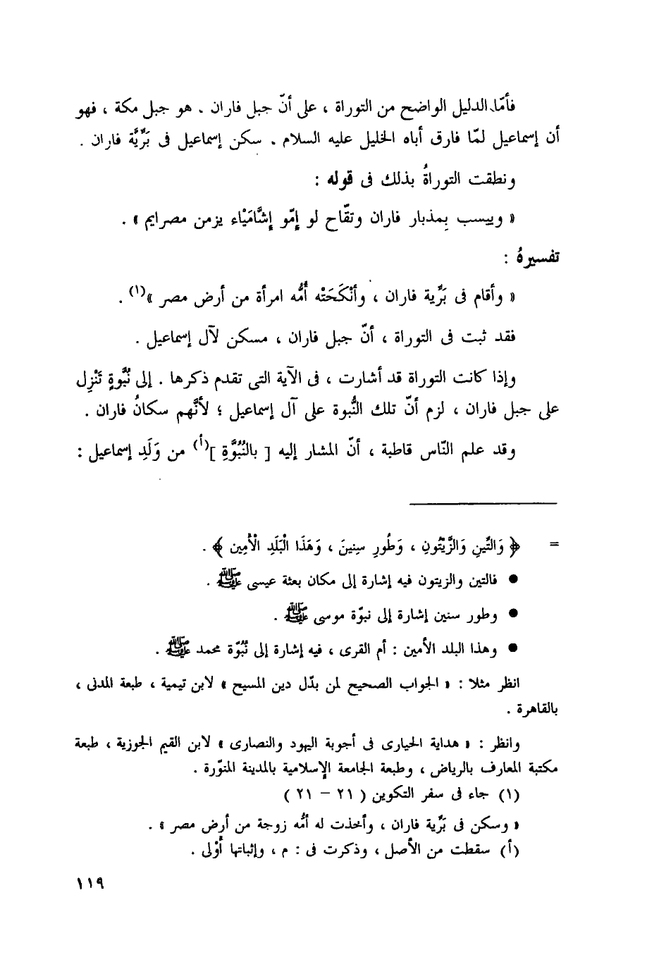 فَأَما الدَّلِيل الْوَاضِح من التَّوْرَاة على أَن جبل فاران هُوَ جبل مَكَّة فَهُوَ أَن إِسْمَاعِيل لما فَارق أَبَاهُ الْخَلِيل عَلَيْهِ السَّلَام سكن إِسْمَاعِيل فِي بَريَّة فاران