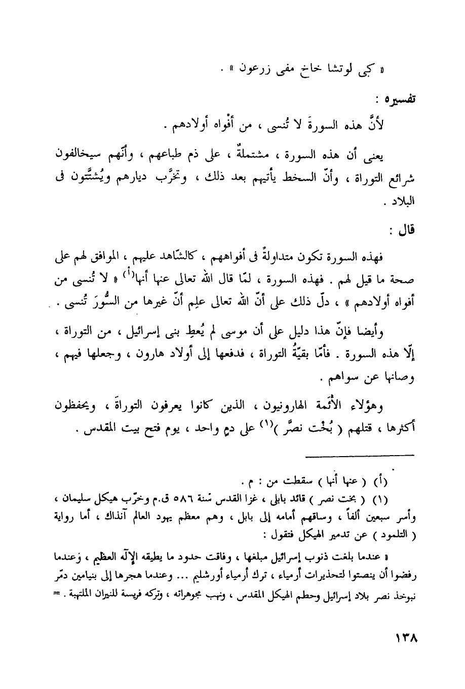 فَهَذِهِ السُّورَة تكون متداولة فِي أَفْوَاههم كالشاهد عَلَيْهِم الْمُوَافق لَهُم على صِحَة مَا قيل لَهُم فَهَذِهِ السُّورَة لما قَالَ الله تَعَالَى عَنْهَا أَنَّهَا لَا تنسى من أَفْوَاه أَوْلَادهم دلّ ذَلِك على أَن الله تَعَالَى علم أَن غَيرهَا من السُّور تنسى