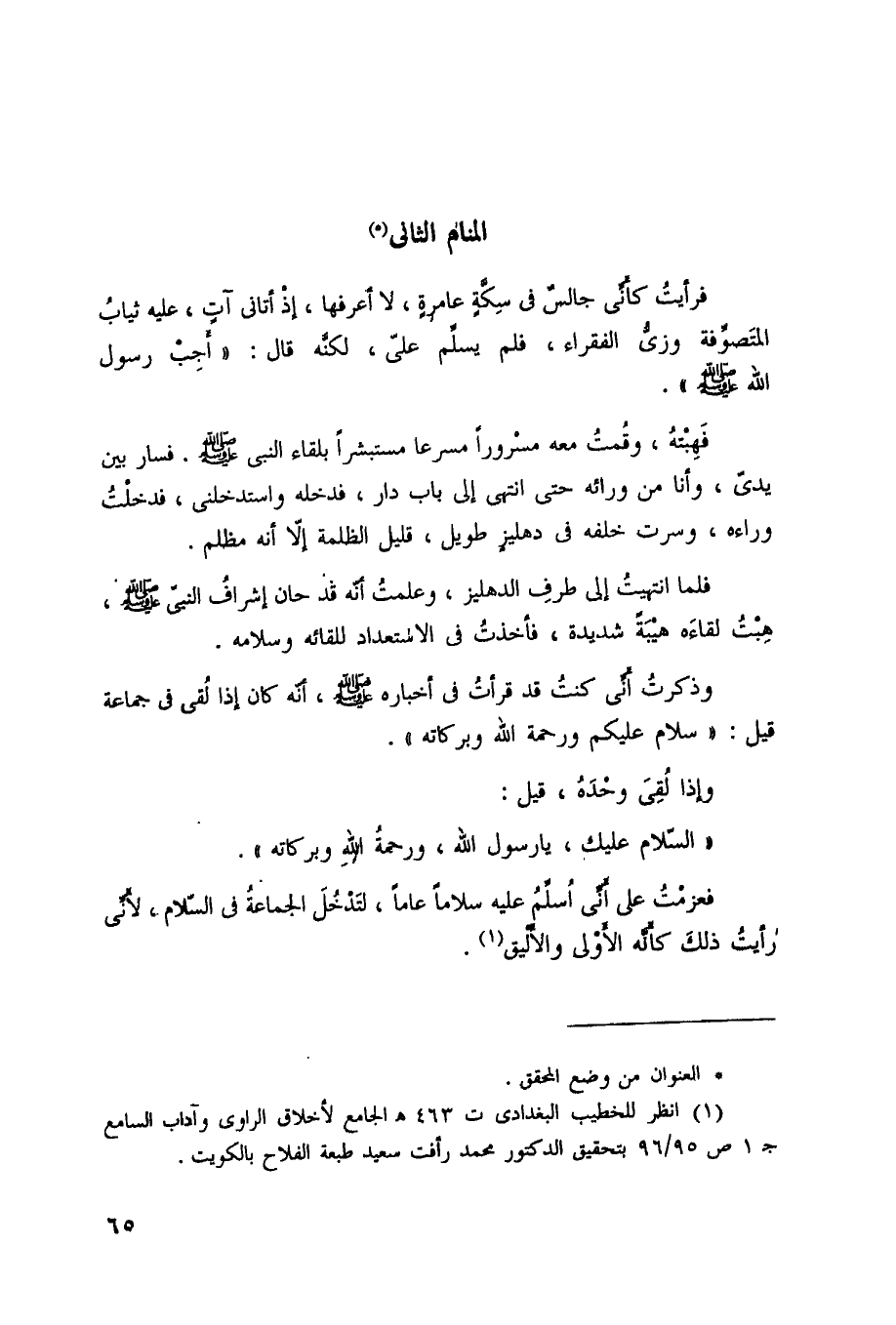 فَرَأَيْت كَأَنِّي جَالس فِي سكَّة عامرة لَا أعرفهَا إِذْ أَتَانِي آتٍ عَلَيْهِ ثِيَاب المتصوفة وزي الْفُقَرَاء فَلم يسلم عَليّ لكنه قَالَ أجب رَسُول الله صلى الله عَلَيْهِ وَسلم