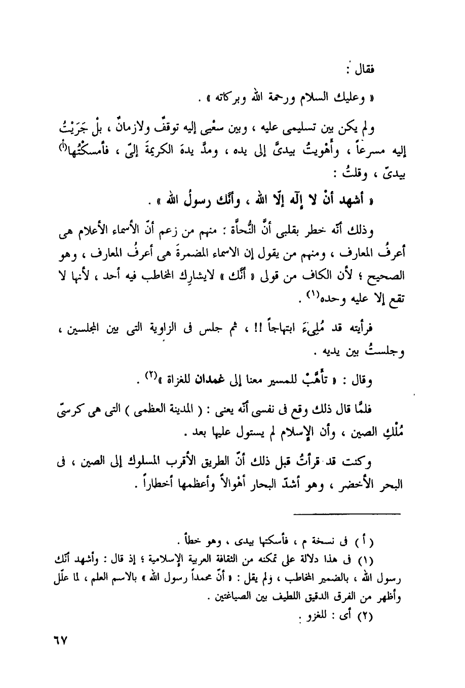 وَكنت قد قَرَأت قبل ذَلِك أَن الطَّرِيق الْأَقْرَب المسلوك إِلَى الصين فِي الْبَحْر الْأَخْضَر وَهُوَ أَشد الْبحار أهوالا وَأَعْظَمهَا أخطارا