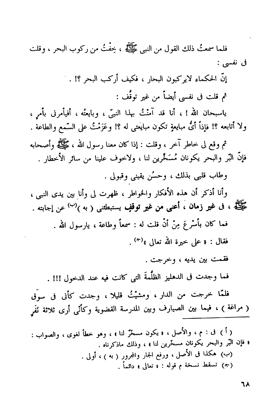 وَأَنا أذكر أَن هَذِه الأفكار والخواطر ظَهرت لي وَأَنا بَين يَدي النَّبِي صلى الله عَلَيْهِ وَسلم فِي غير زمَان أعنى من غير توقف يستبطئني بِهِ عَن إجَابَته فَمَا كَانَ بأسرع من ان قلت لَهُ سمعا وَطَاعَة يَا رَسُول الله