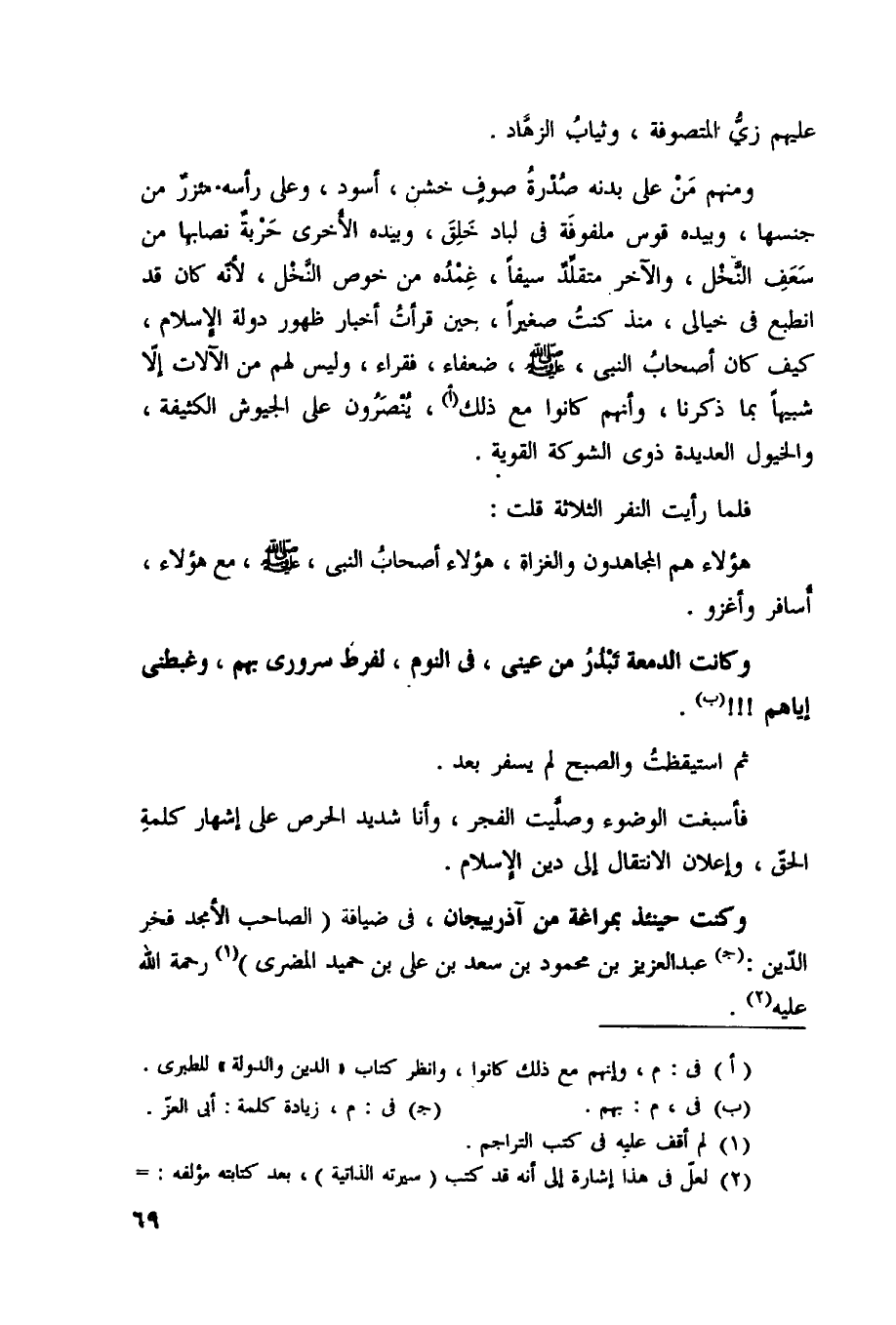 وَمِنْهُم من على بدنه صدرة صوف خشن أسود وعَلى رَأسه مئزر من جِنْسهَا وَبِيَدِهِ قَوس ملفوفة فِي لباد خلق وَبِيَدِهِ الْأُخْرَى حَرْبَة نصابها من سعف النّخل وَالْآخر متقلد سَيْفا غمده من خوص النّخل لِأَنَّهُ كَانَ قد انطبع فِي خيالي مُنْذُ كنت صَغِيرا حِين قَرَأت أَخْبَار ظُهُور دولة الْإِسْلَام كَيفَ كَانَ أَصْحَاب النَّبِي صلى الله عَلَيْهِ وَسلم ضعفاء فُقَرَاء وَلَيْسَ لَهُم من الْآلَات إِلَّا شَبِيها بِمَا ذكرنَا وَأَنَّهُمْ كَانُوا مَعَ ذَلِك ينْصرُونَ على الجيوش الكثيفة والخيول العديدة ذوى الشَّوْكَة القوية