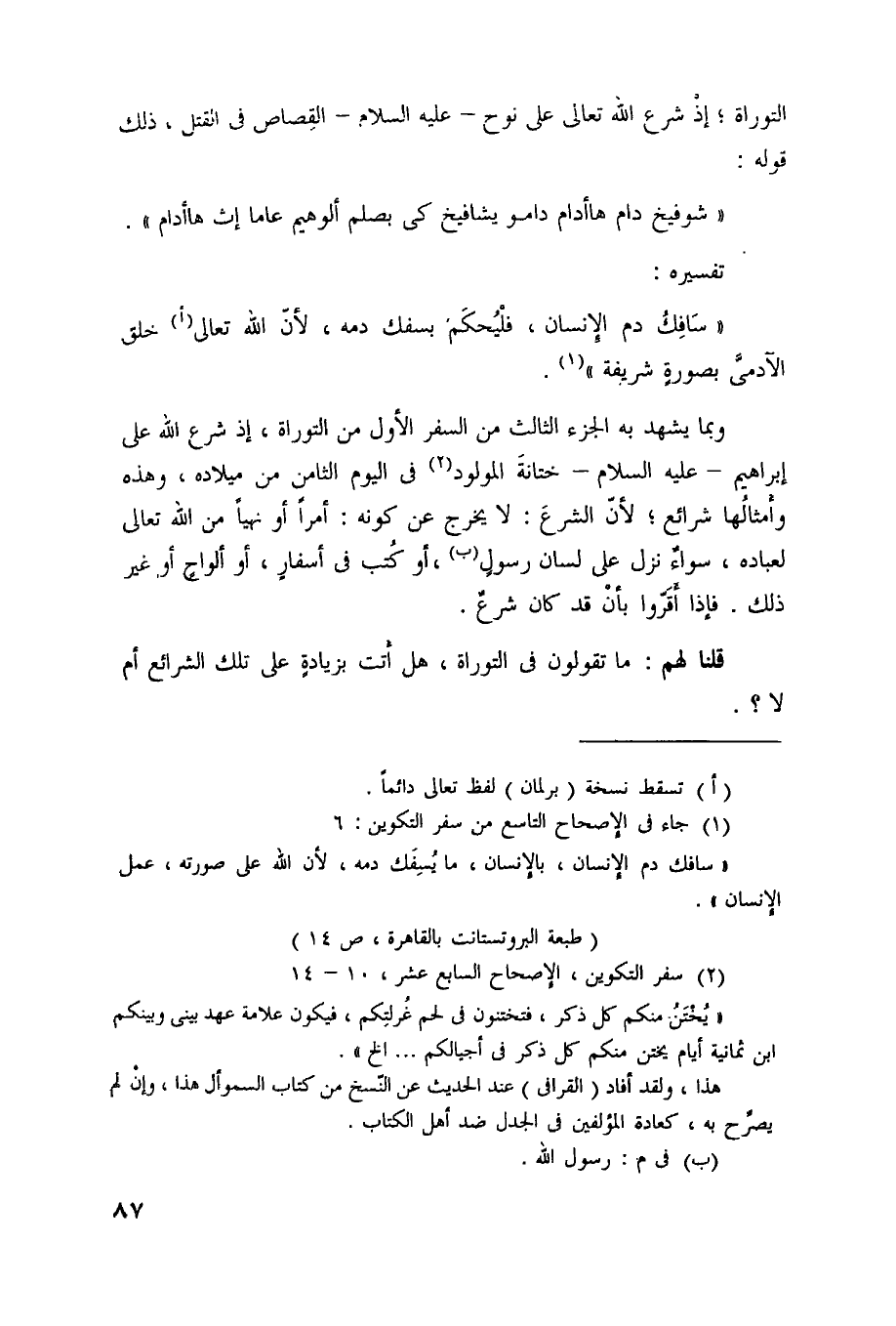 وَبِمَا يشْهد بِهِ الْجُزْء الثَّالِث من السّفر الأول من التَّوْرَاة إِذْ شرع الله على إِبْرَاهِيم عَلَيْهِ السَّلَام ختانة الْمَوْلُود فِي الْيَوْم الثَّامِن من ميلاده وَهَذِه وأمثالها شرائع لِأَن الشَّرْع لَا يخرج عَن كَونه أمرا أَو نهيا من الله تَعَالَى لِعِبَادِهِ سَوَاء نزل على لِسَان رَسُول أَو كتب فِي أسفار أَو أَلْوَاح أَو غير ذَلِك فَإِذا أقرُّوا بِأَن قد كَانَ شرع